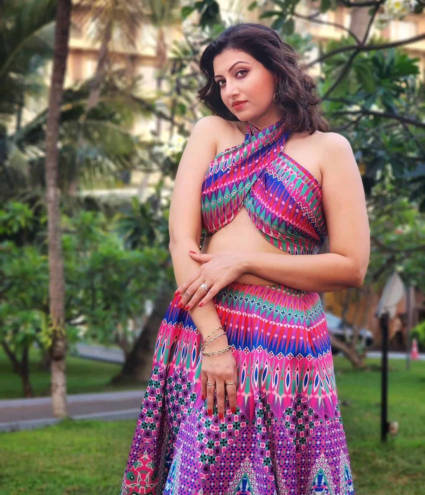 Hamsa Nandini, a name synonymous with resilience and grace, emerges like a vibrant butterfly in this captivating photograph. After a period of hardship, she blossoms anew, adorned in a multicolored crop top and matching skirt, reminiscent of a flower in full bloom. The outfit’s vibrant hues dance across her form, mirroring the inner strength she has cultivated.