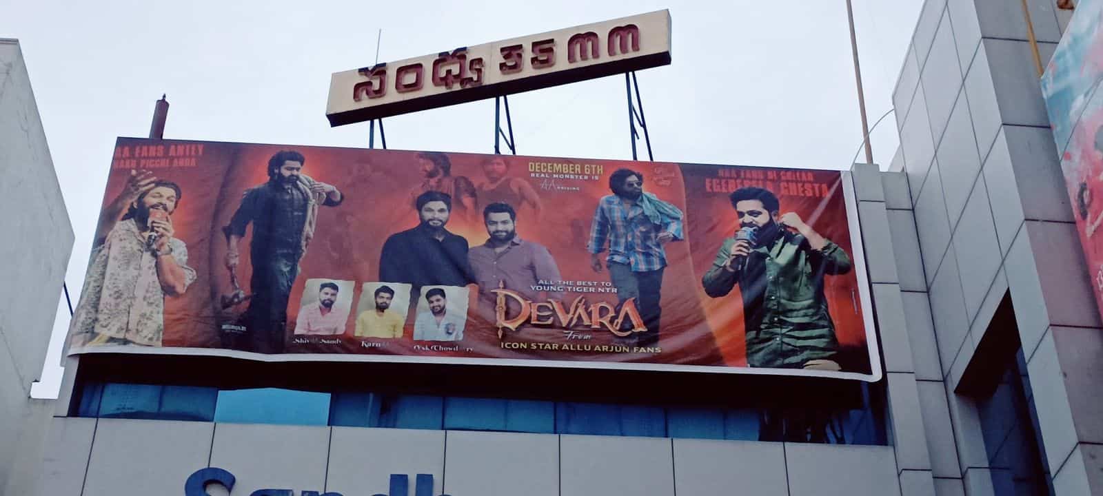 Allu Arjun’s fans have come forward, erecting the banners, wishing NTR and team Devara on account of their film’s release tomorrow. Usually, we see the same hero’s fans erecting the banners at theatres. Rarely do we see other fans also taking part in this tradition.