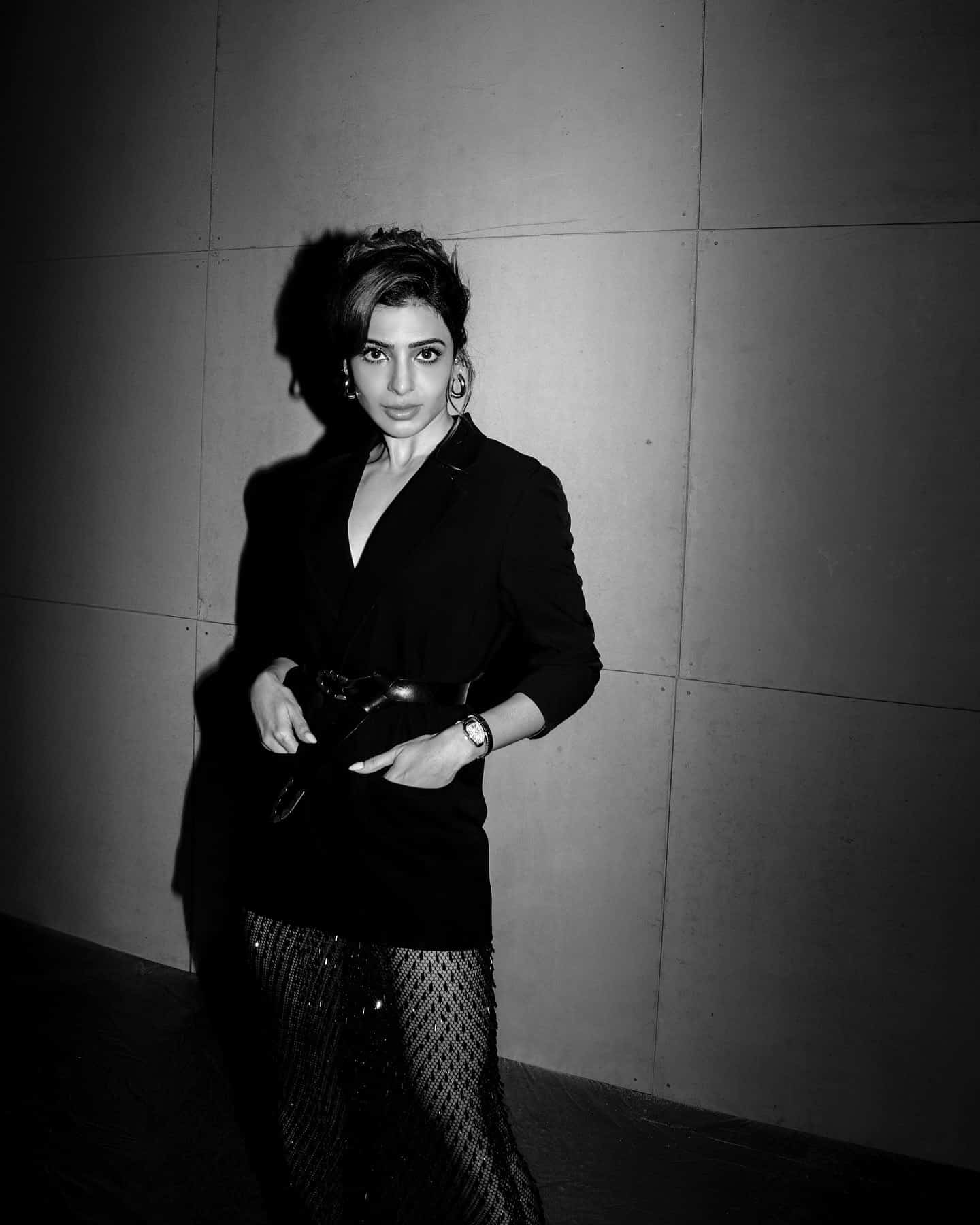 Samantha Ruth Prabhu never fails to turn heads with her impeccable style, and her recent appearance at the trailer launch of her much-awaited series Citadel: Honey Bunny was no exception! The stunning actress wowed fans as she stepped out in a chic black long dress that perfectly highlighted her elegant style. Paired with matching heels and silver statement earrings, Samantha looked nothing short of classy, commanding attention with every step.
