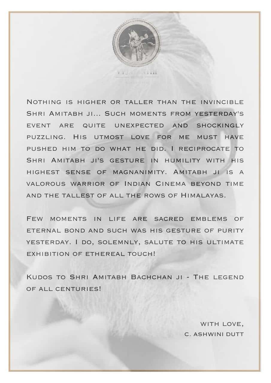 “Nothing is higher or taller than the invincible Shri Amitabh Ji. Such moments from yesterday’s event are quite unexpected and shockingly puzzling. His utmost love for me must have pushed him to do what he did. I reciprocate to Amitabh ji’s gesture in humility with his highest sense of magnanimity. Few moments in life are sacred emblems of eternal bond, and such was his gesture of purity yesterday. I do solemnly salute his ultimate ethereal touch. Kudos to Amitabh Bachchan Ji – The legend of all centuries,” wrote the ace producer.