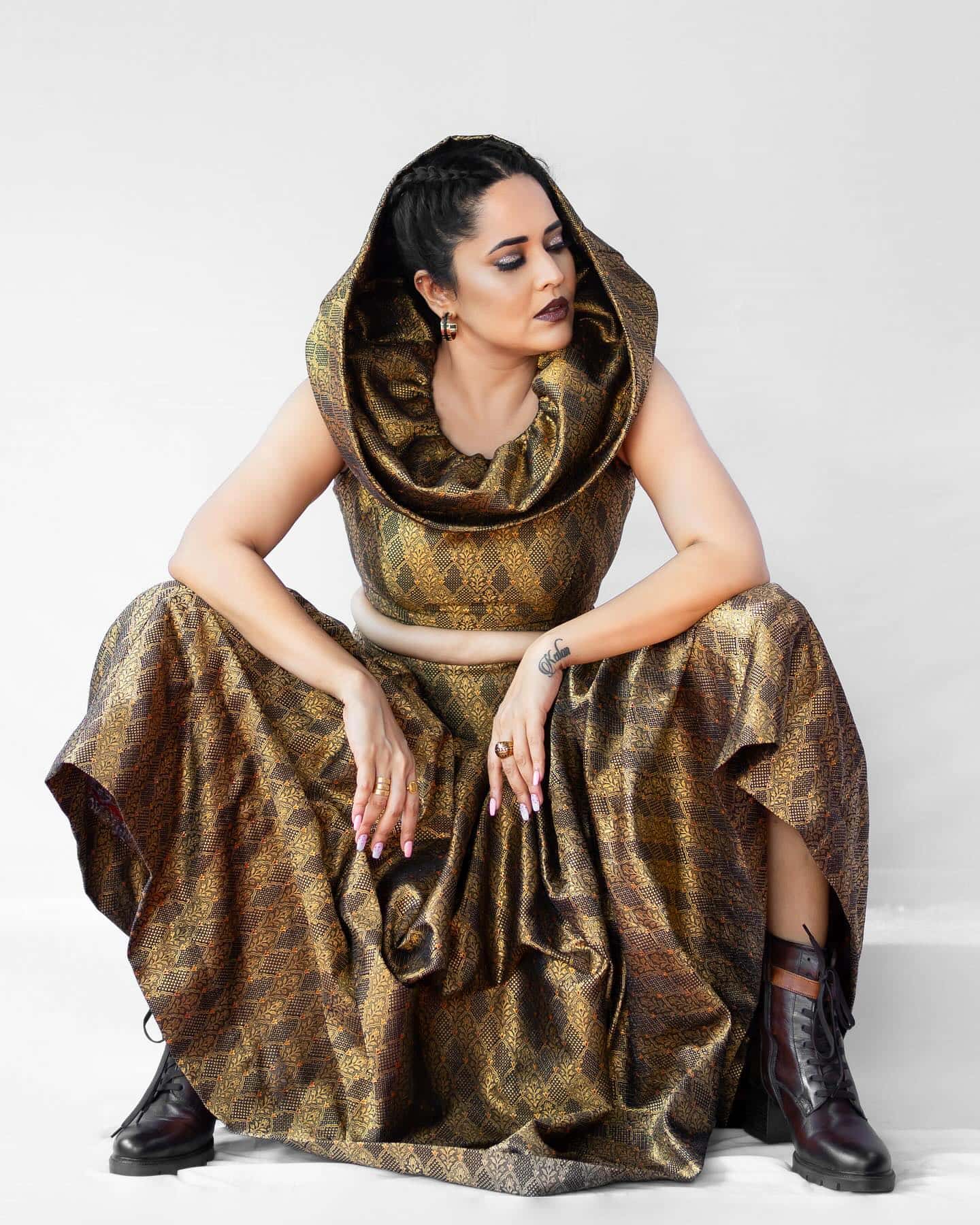 Dressed in a golden and black crop top with a matching skirt, Anasuya looks absolutely fierce. The outfit, paired with black boots, adds an edge to her look. Her makeup is on point with black mascara, glossy skin, silver eyeliner, and brown lipstick. The hoop earrings complete the look, giving her a regal and mysterious aura.