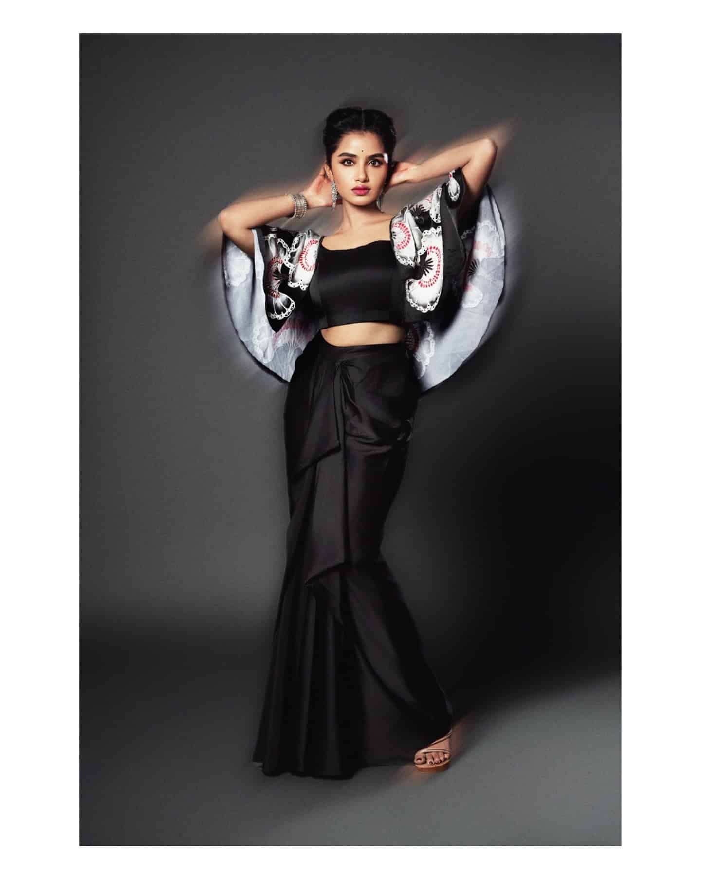 The actress is rocking a black crop top with intricate white detailing and flowing sleeves. The unique top is paired with a matching skirt, creating a cohesive and stylish monochrome look. Red lipstick adds a pop of color, while black mascara keeps the eye makeup subtle. Anupama rocks a sleek high bun hairstyle, highlighting her sharp features. Silver bangles and earrings complete the elegant ensemble.