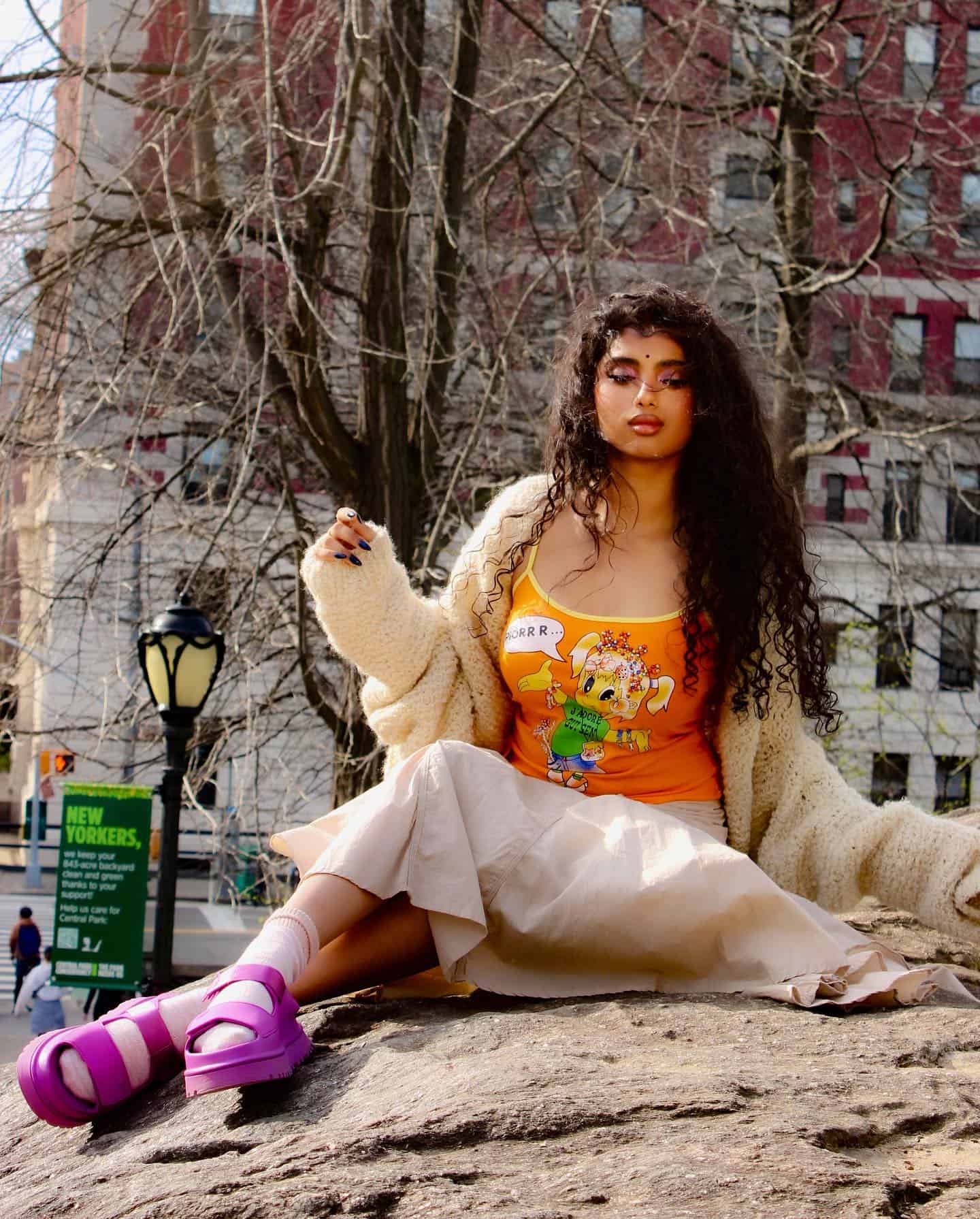In the pictures, Avantika is seen sitting on a rock, dressed in a vibrant orange cartoon camisole, a cozy sweater, and a skirt. Her footwear complements the outfit with eye-catching purple slip-ons. Avantika’s makeup is a beautiful blend of bold and subtle. She rocks a red lipstick and red eyeliner, creating a dramatic effect. A tiny black bindi adds a touch of tradition. To balance the bold elements, she opts for subtle makeup on her cheeks and winged black mascara that accentuates her curly hair. The overall look is stunning and showcases Avantika’s unique style.