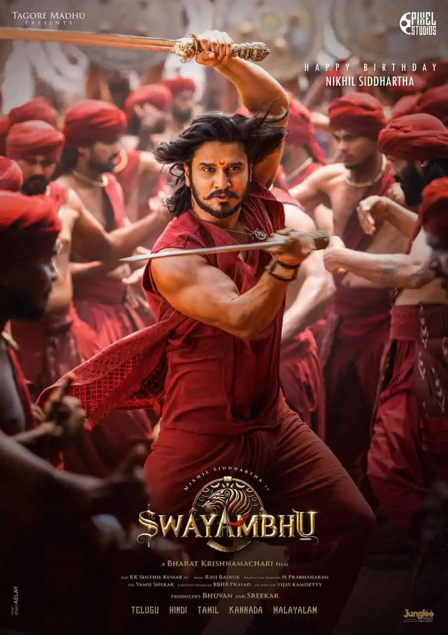 Wishing Nikhil on his birthday, a special poster was unveiled. Dressed in a maroon color outfit, Nikhil appears like a warrior with two swords in both hands. He looked ferocious here. The poster is a testament to the grandeur in making the movie, and Nikhil’s dedication is clearly visible here.