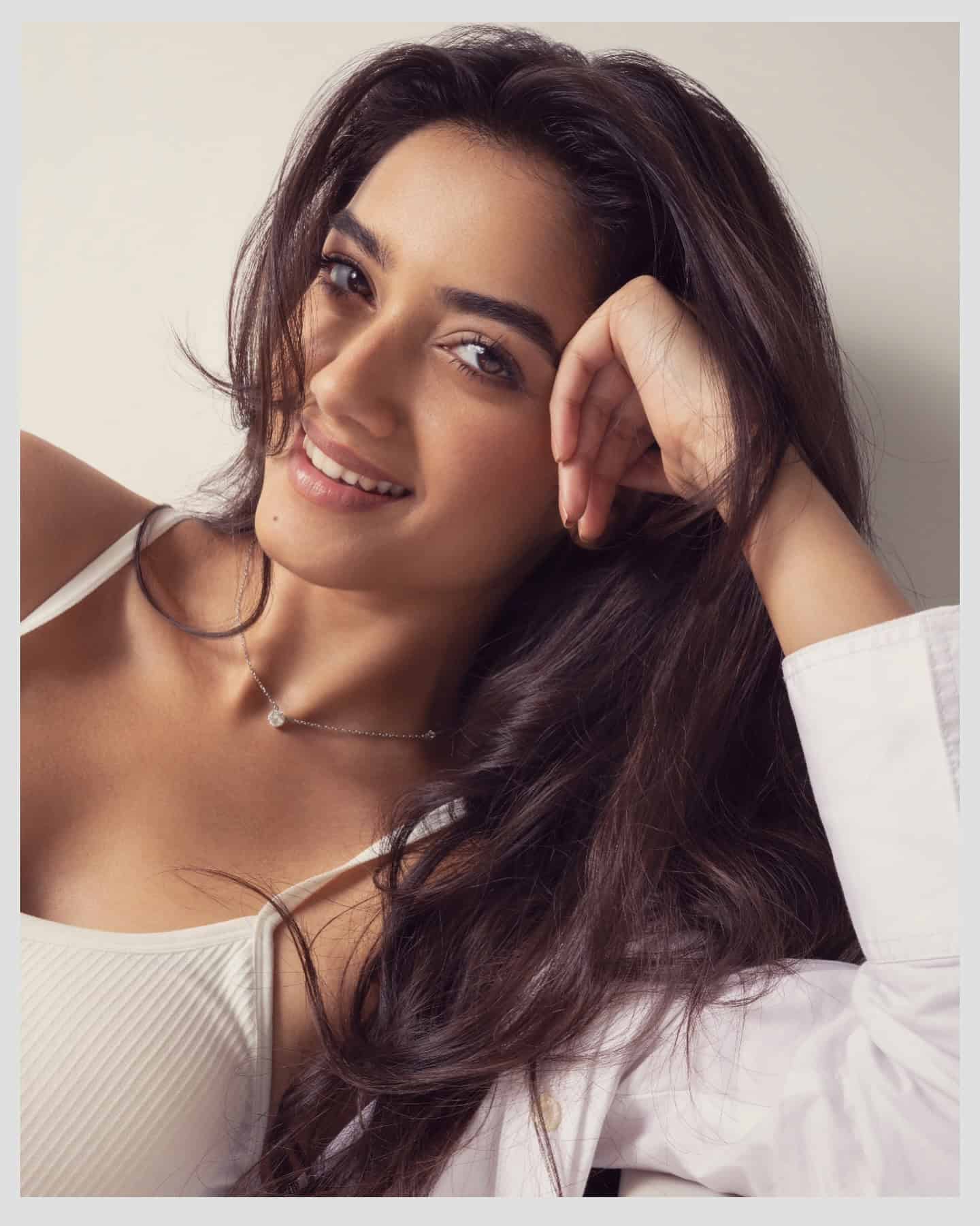 In the pictures, she’s rocking a cream bralette with blue shorts and an open shirt, showcasing her stunning figure and captivating smile. Her open hair and minimal makeup complete the look, making her appear both sexy and elegant.