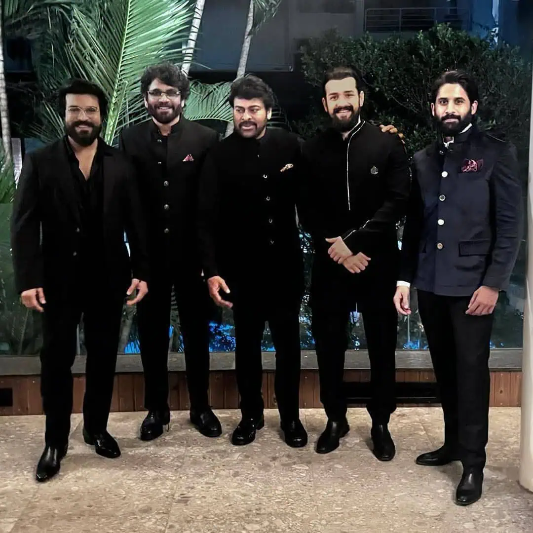 The event had all the guests in their stylish best looks and Chiru posted two unseen pictures from the event. Chiranjeevi revealed a picture of himself posing with Nagarjuna, Charan, Akhil, and Naga Chaitanya all shining in blazers.