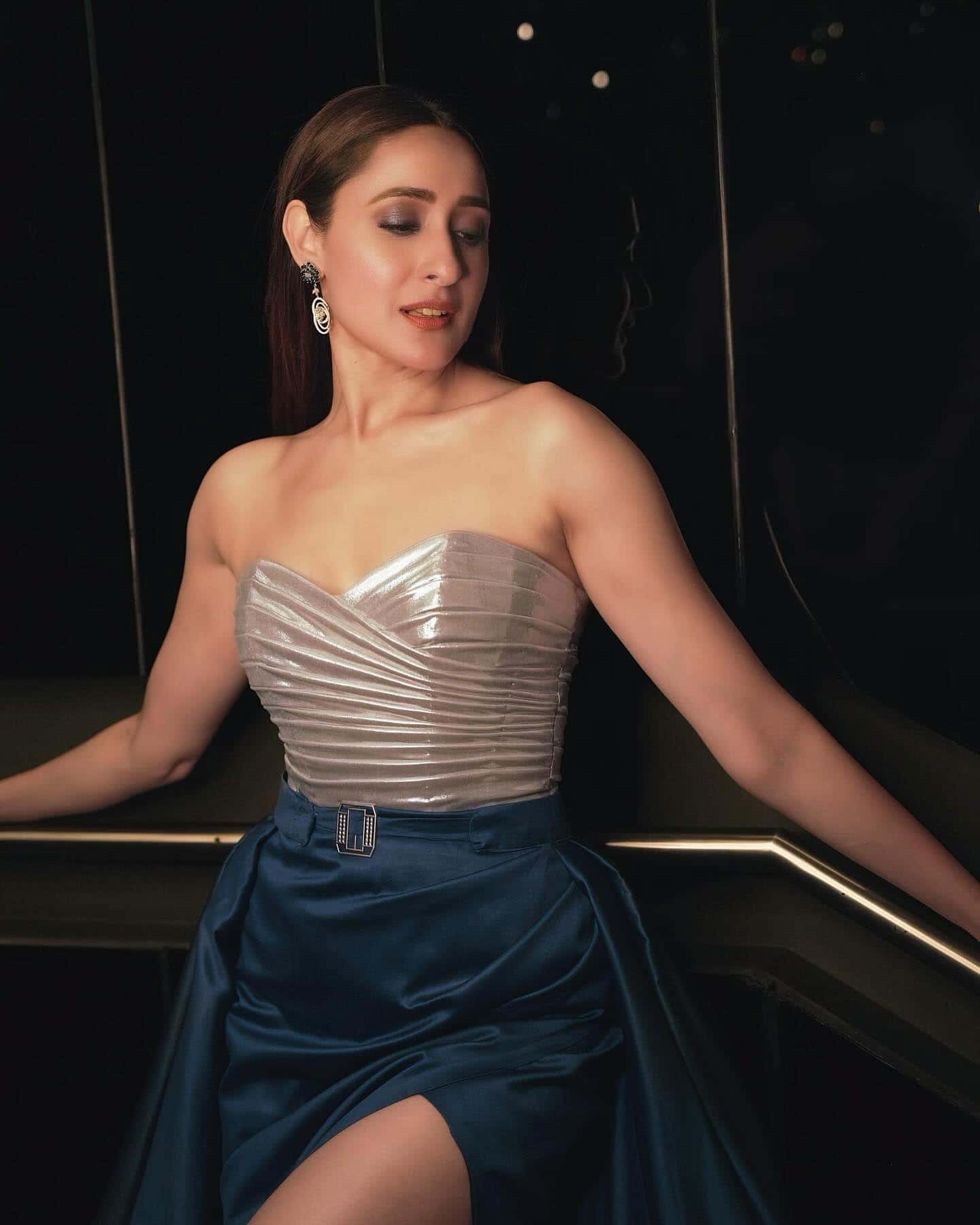 Styled to perfection, Pragya paired her dazzling attire with eye-catching silver earrings that added just the right amount of sparkle to her look. Her luscious open hair cascaded down her shoulders, framing her face beautifully, while her glossy pink lipstick provided a pop of color that complemented her ensemble. Whether climbing the stairs or striking sexy poses, Pragya’s confidence shone through every frame, solidifying her status as a true bombshell.