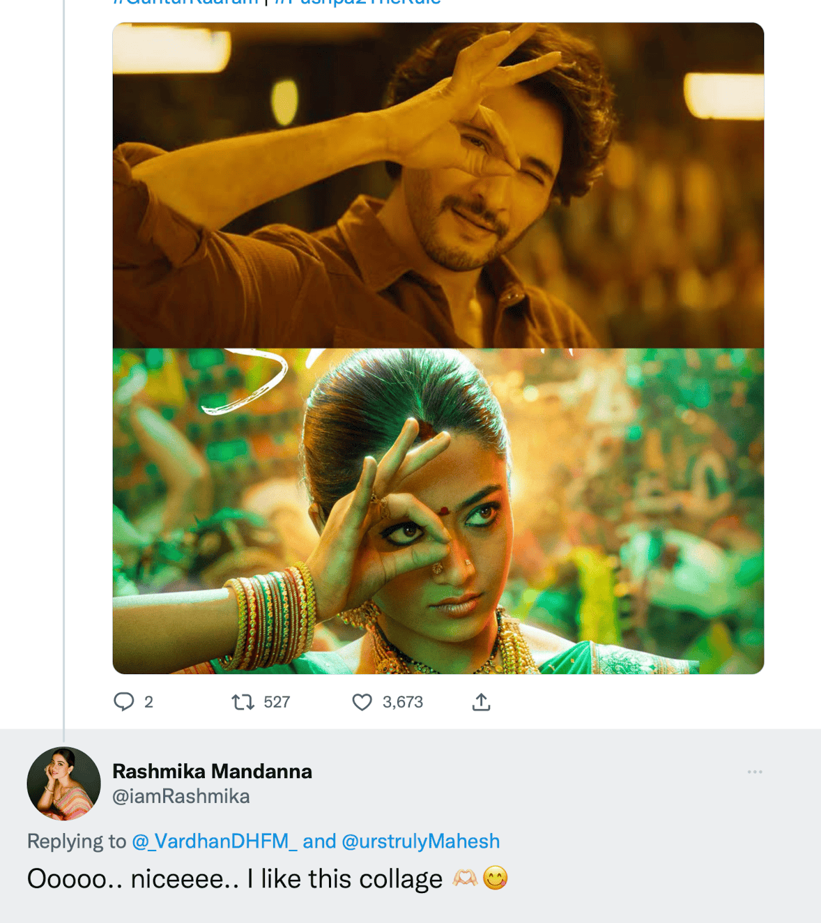 With a collage featuring Mahesh’s Guntur Kaaram picture and Rashmika’s Pushpa 2 pose going viral, the actress has finally decided to respond on that. Taking to her Twitter she replied to the comparison, saying, “Ooo Nicee, I like this collage” and added a ‘love’ emoji too. It looks like even Rashmika is happy with this comparison, while the comparison actually happened for the sake of trolling her.