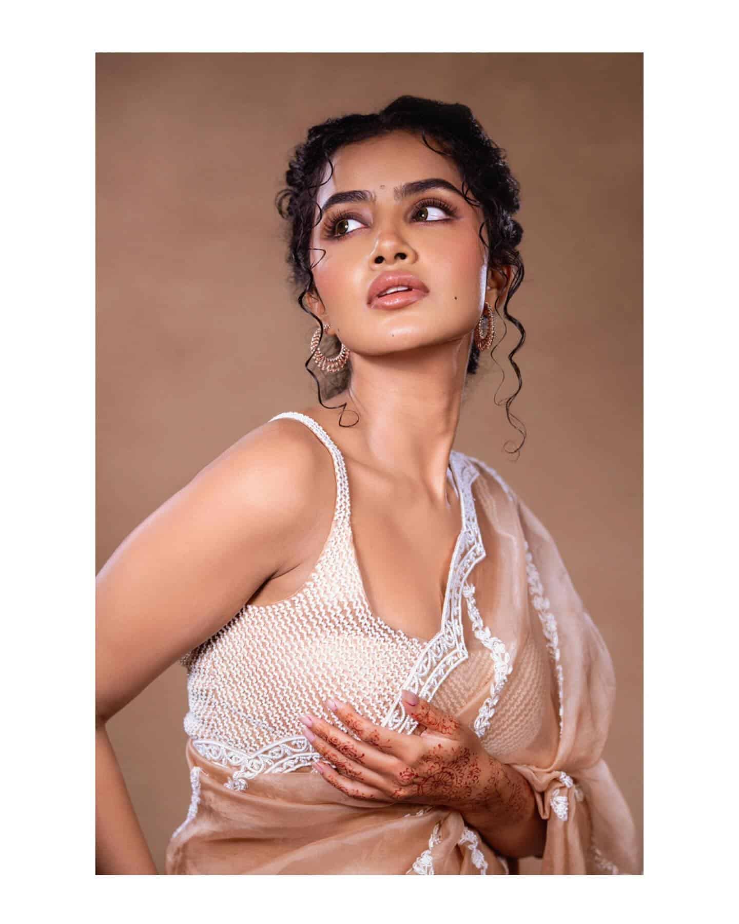 Dressed in a flowing cream saree, Anupama resembles a delicate wildflower swaying in the breeze. The sleeveless blouse adds a touch of modern elegance, while the subtle makeup keeps the focus on her natural features. Studded earrings shimmer like dewdrops, complementing the vibrant orange lipstick that pops like a splash of color against the soft cream. Her curly hair, cascading down her shoulders, adds a touch of wild charm, and her beautiful smile exudes warmth and genuine joy.