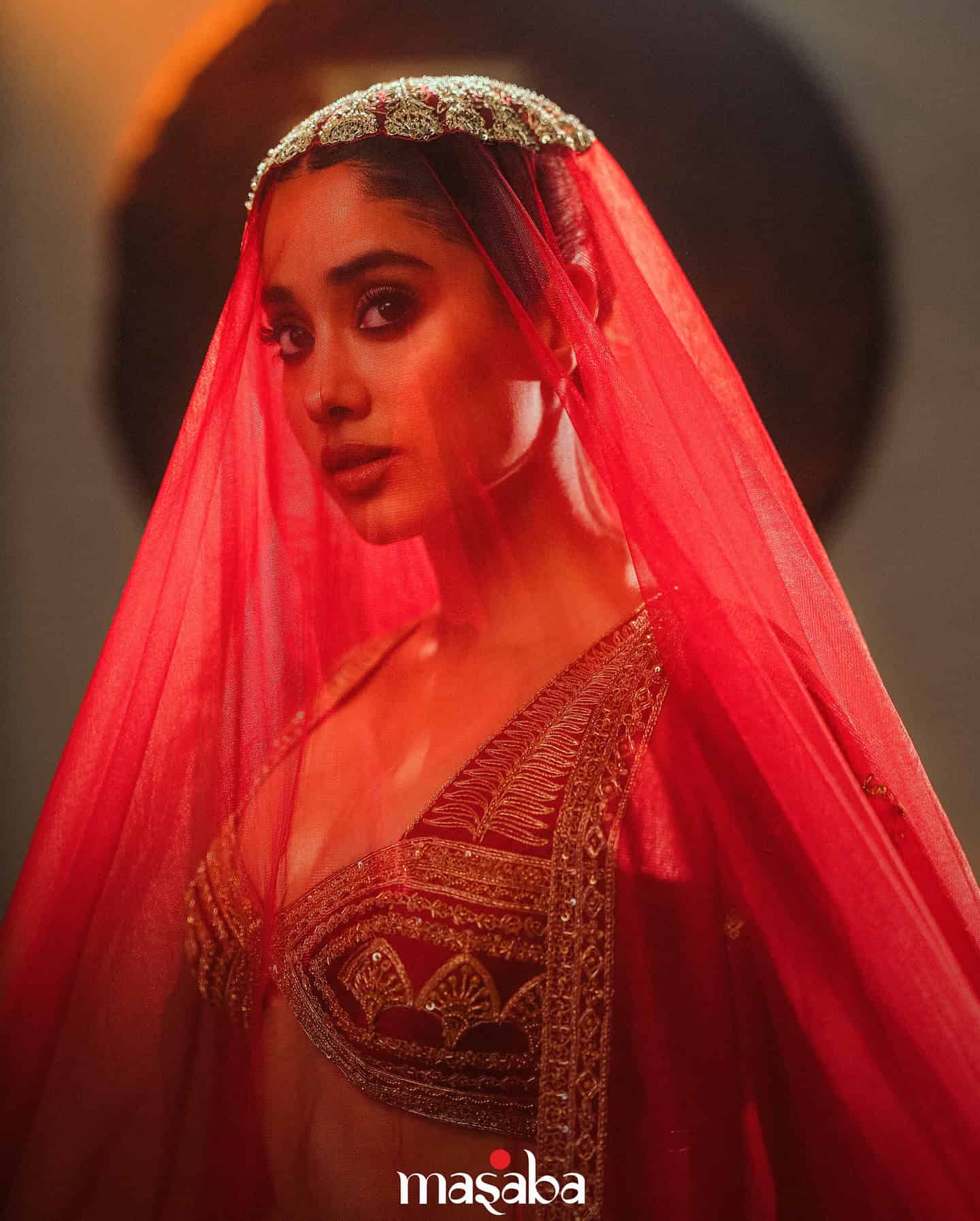 In her latest photos, she’s seen in a striking red and gold lehenga by Masaba. The blouse has a deep-cut neckline with gold embroidery, and the skirt is full and detailed with bold patterns. She plays with the dupatta in different poses, sometimes flowing behind her, sometimes wrapped around, adding movement to the shots. In a few frames, she adds a long bridal-style veil, giving off a dramatic, royal look. Hair tied in a clean bun, a bold headpiece, and a mix of graceful and playful poses make the shoot stand out.