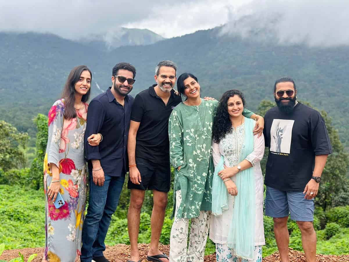 In the shared photos, Rishab Shetty appeared relaxed in a t-shirt and shorts, while Jr NTR was seen in denim and a blue shirt. Pragathi and Lakshmi Pranathi chose traditional attire—Pragathi in a white and blue salwar suit and Lakshmi in a vibrant multi-colored suit.