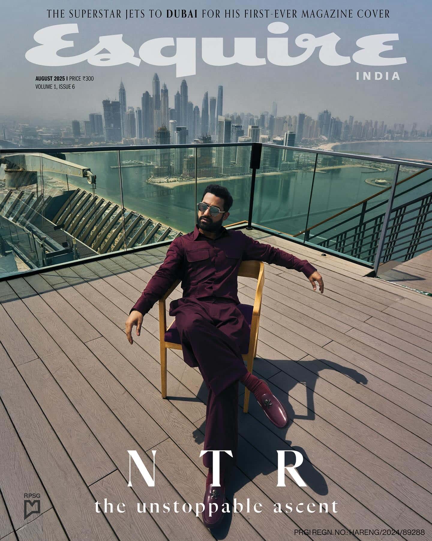 Jr. NTR, who will share the screen with Hrithik Roshan in War 2, appears on his first Esquire India cover. The shoot took place at The View, Palm Jumeirah in Dubai, with the skyline framing his confident pose.