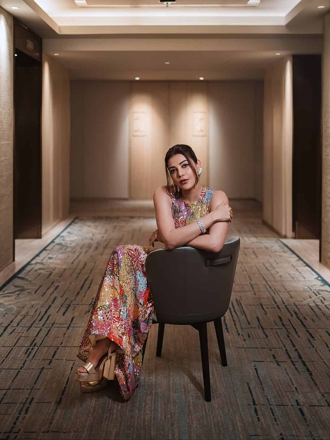 Her latest photos bring a different buzz. Kajal posed in a sleeveless multicolour gown, styled with a neat high bun and golden ornaments. The mix of vibrant tones and bold accessories gave her a hot and striking appearance. She carries the look with ease, showing why she is still a favourite for fashion watchers.