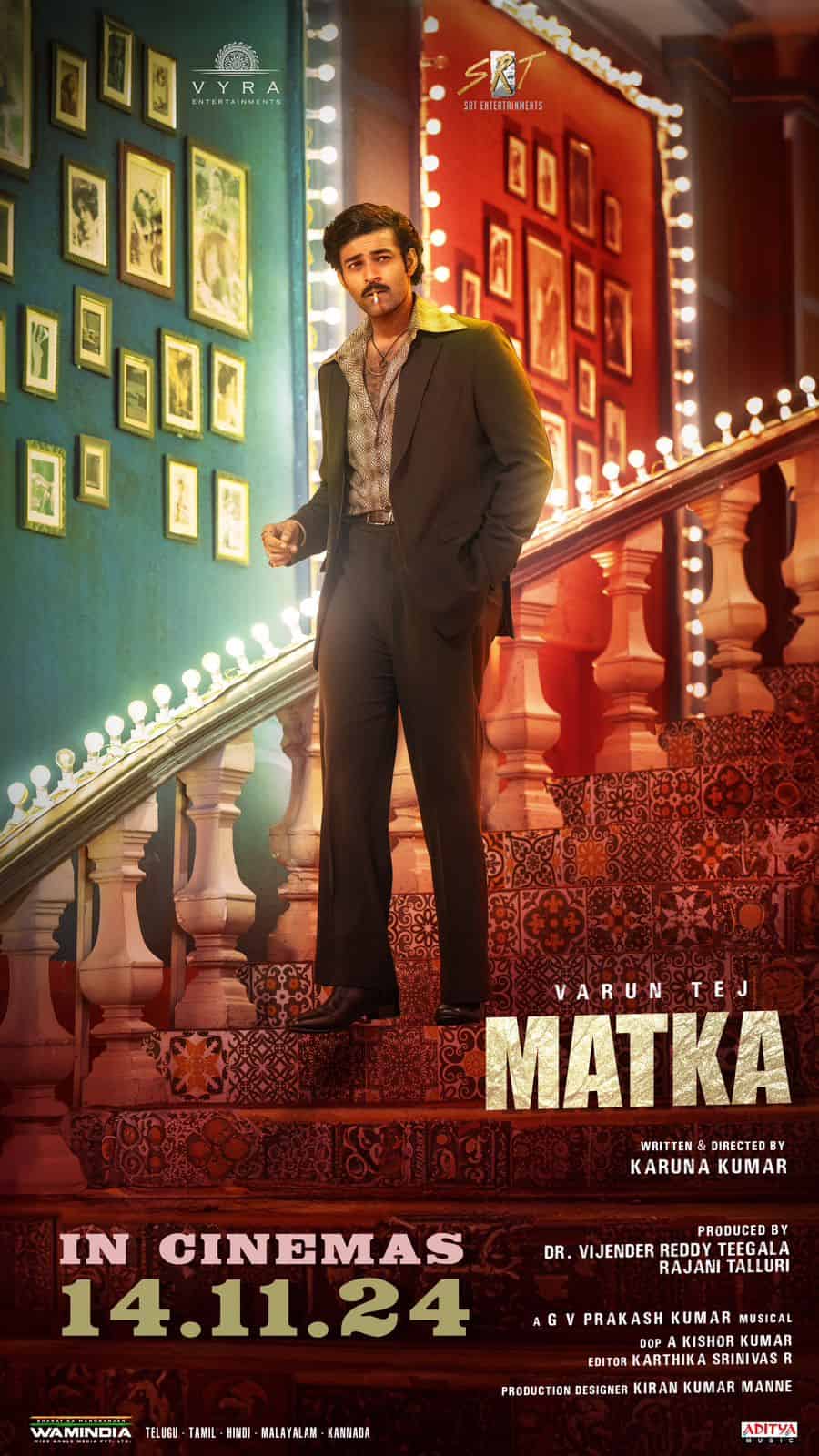 Varun Tej oozes charm as the Matka King symbolizing the 80s style effortlessly. He is seen walking stylishly on the stairs with a cigarette in his mouth.