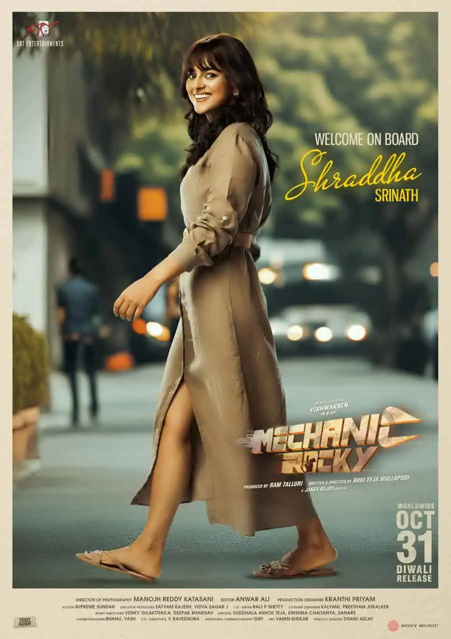 Shraddha Srinath who plays one of the female leads makes a stylish entry. The poster sees Shraddha Srinath in a maxi slit dress flashing smile. The actress who underwent a stylish makeover appears stunning here. The movie also has Meenakshi Chaudhary playing the other heroine.