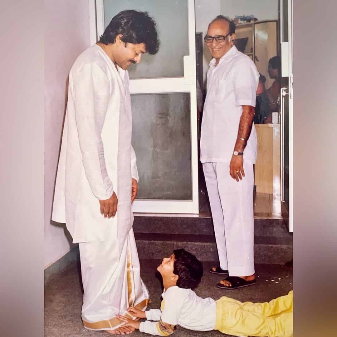 The image sees a young Varun Tej touching the feet of Chiranjeevi, who has been a guiding light, not just for Varun Tej, but for all the heroes from the mega compound. Also present in the nostalgic photograph is Varun Tej’s grandfather Konidela Venkata Rao.