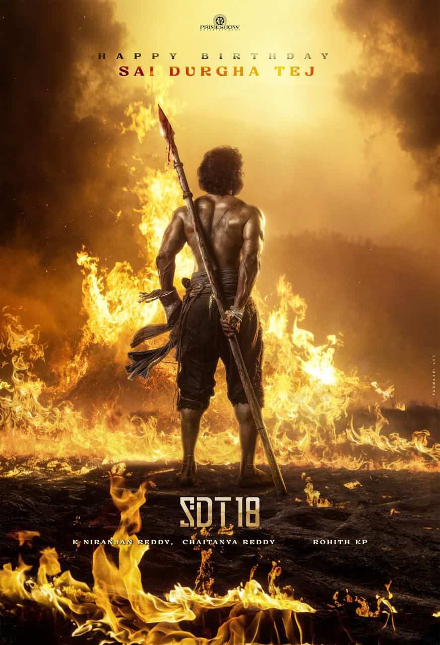The poster shows SDT standing boldly like a hero, holding a spear with fire blazing all around him. Sai Durgha Tej has experienced a remarkable makeover for his character in the movie. His commitment to fitness is evident in his bulked-up, stunning appearance, which reflects his hard work and discipline.