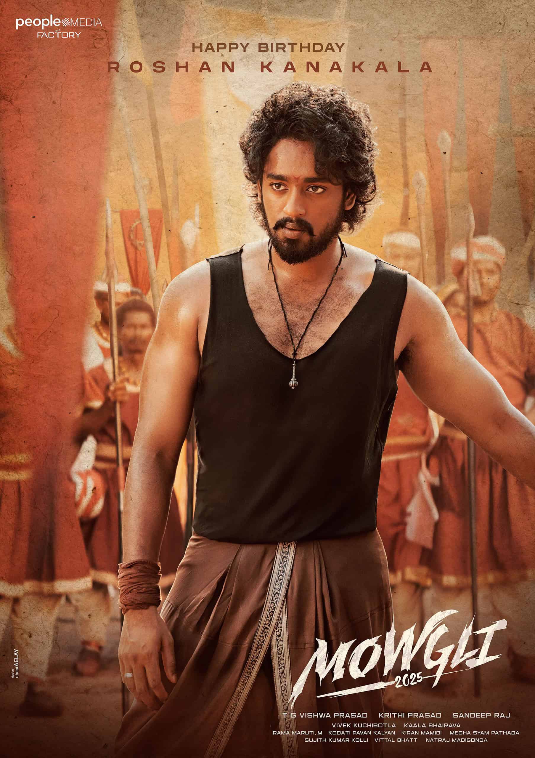 On the occasion of Roshan Kanakala’s birthday, his character poster from the movie was released. Roshan exudes strength and intensity, dressed in a vest and lungi that highlights his muscular physique. A group of soldiers standing behind him hints at the adventurous plot awaiting viewers.