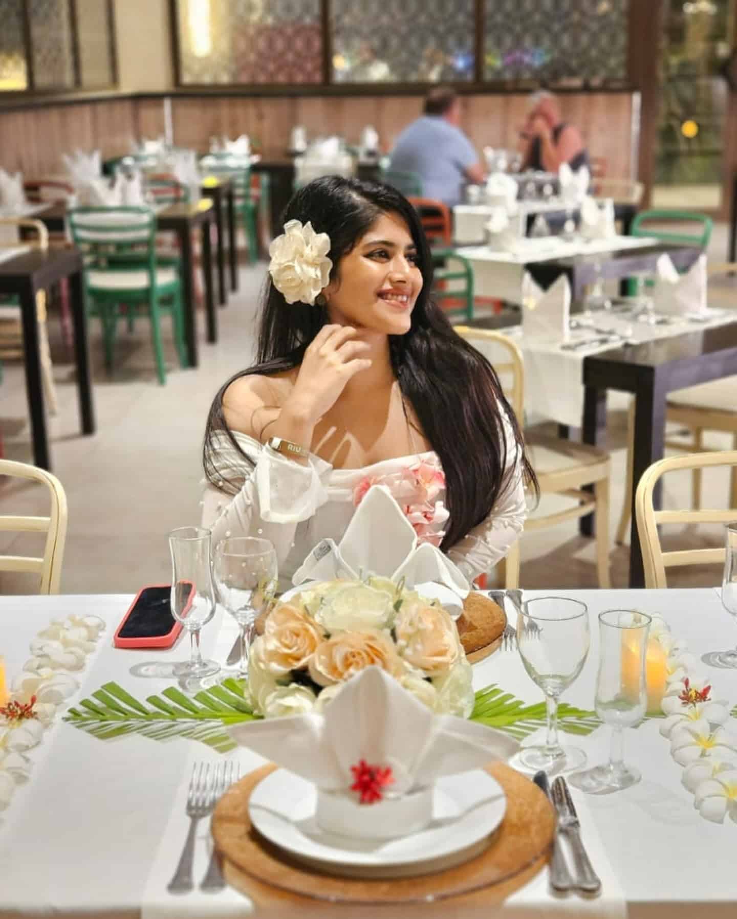 In one of her latest posts, Megha is seen looking absolutely gorgeous in a shoulder-drop white dress. She pairs the outfit with a refreshing drink and adorns her hair with beautiful flowers, adding a touch of elegance and natural beauty. As she poses for the camera, her glowing skin and glossy makeup complete the picture, making her look nothing short of a goddess.