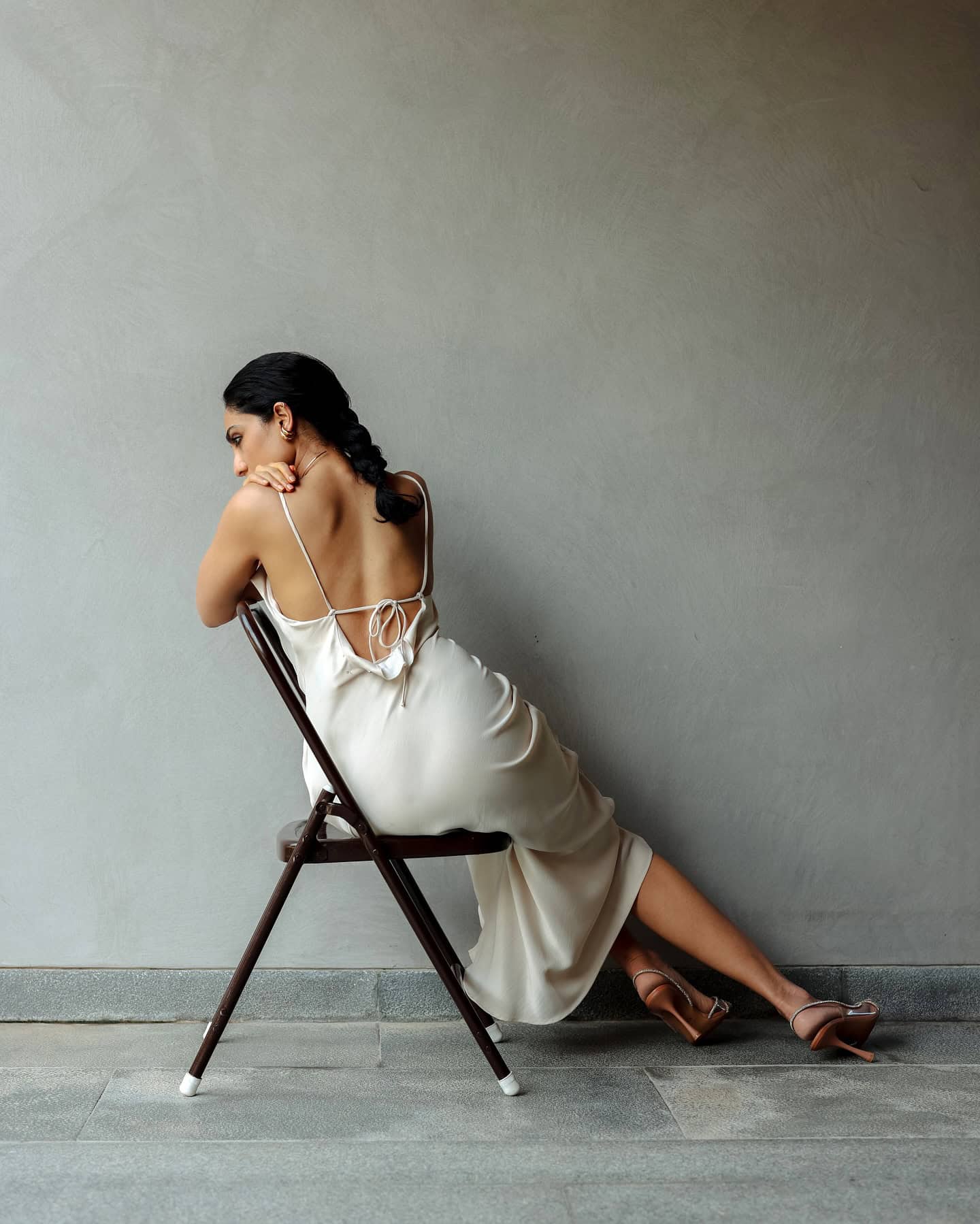 Dressed in a Zara cream-colored backless strappy gown, Sobhita exudes a glamorous aura. The ensemble is complemented by silver heels, braided hair, golden earrings, black mascara, pink lipstick, and a golden necklace. The backless design adds a touch of sensuality to the overall look, making her appear effortlessly hot and confident.