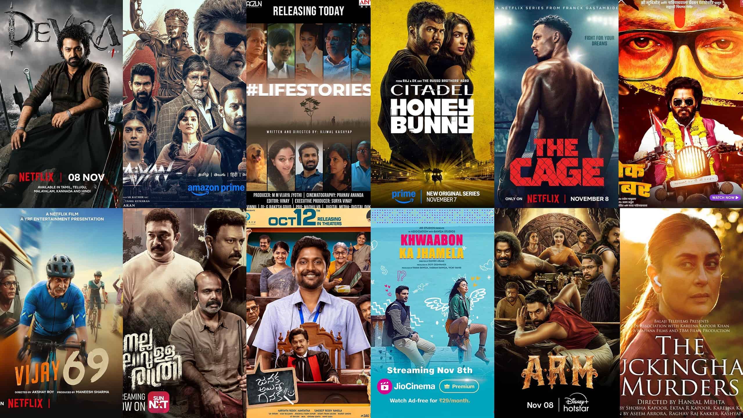 Movie / Web SeriesPlatformGenre | LanguagesDevaraNetflixCommercial Entertainer | Tel, Tam, Kan & MalThe Buckingham MurdersNetflixMystery Thriller | Hin & EngVijay 69NetflixSlice-of-Life Drama | HindiPedro ParamoNetflixHorror Drama | Spa, Eng & HinMeet Me Next ChristmasNetflixRom-Com | EnglishOuter Banks – S – S2 – P2NetlifxSuspense Drama | EnglishInvestigation AlienNetflixDocumentary | EnglishArcane – S – S2NetflixAnime Action Drama | EnglishMr Plakton – S – S1NetflixRom-Com | KoreanBank Under Siege – S – S1NetflixAction Thriller | SpanishThe Cage – S – S1NetflixRom-Com | FrenchLove Is a Poison – S – S1NetflixCourt Room Drama | JapaneseCountdown: Paul Vs Tyson NetflixSports Drama | EnglishLove VillageNetflixReality Show | NetflixARMDisney+ HotstarPeriod Action Drama | Mal, Tel, Tam, Kan & HinGangnam B-Side – S – S1Disney+ HotstarAction Thriller | KoreanVettaiyanPrime VideoCommercial Entertainer | Tam, Tel, Kan, Mal & HinGorre PuranamPrime Video Satirical Comedy | TeluguKozhipannai ChelladuraiPrime VideoRural Drama | Tam, Tel, Kan, Mal & HinVivekanandan ViralanuPrime Video Comedy Drama | MalayalamJackdawPrime VideoAction Thriller | Eng, Tel, Tam & HinMy Old AssPrime VideoComedy Drama | EnglishLook BackPrime VideoAnime Drama | Jap, Eng & HinCitadel: Honey Bunny – S – S1Prime VideoSpy Thriller | Hin, Tel, Tam, Kan & MalBlind – S – S1Prime VideoMystery Thriller | KoreanIn FidelityApple TV+Romantic Drama | EnglishJanaka Aithe GanakaAha VideoFamily Entertainer | TeluguPrasanna VadanamAha TamilPsychological Thriller | TamilLife StoriesETV WINSlice-of-Life Drama | TeluguNalla Nilavulla RathriSun NxtAction Thriller | TamilKhwaabon Ka JhamelaJio CinemaRomantic Drama | HindiDespicable Me 4Jio CinemaAnimation Comedy | Eng, Tel, Taml, Hin, Kan, Ben & MarYek NumberZEE5Action Drama | Marathi