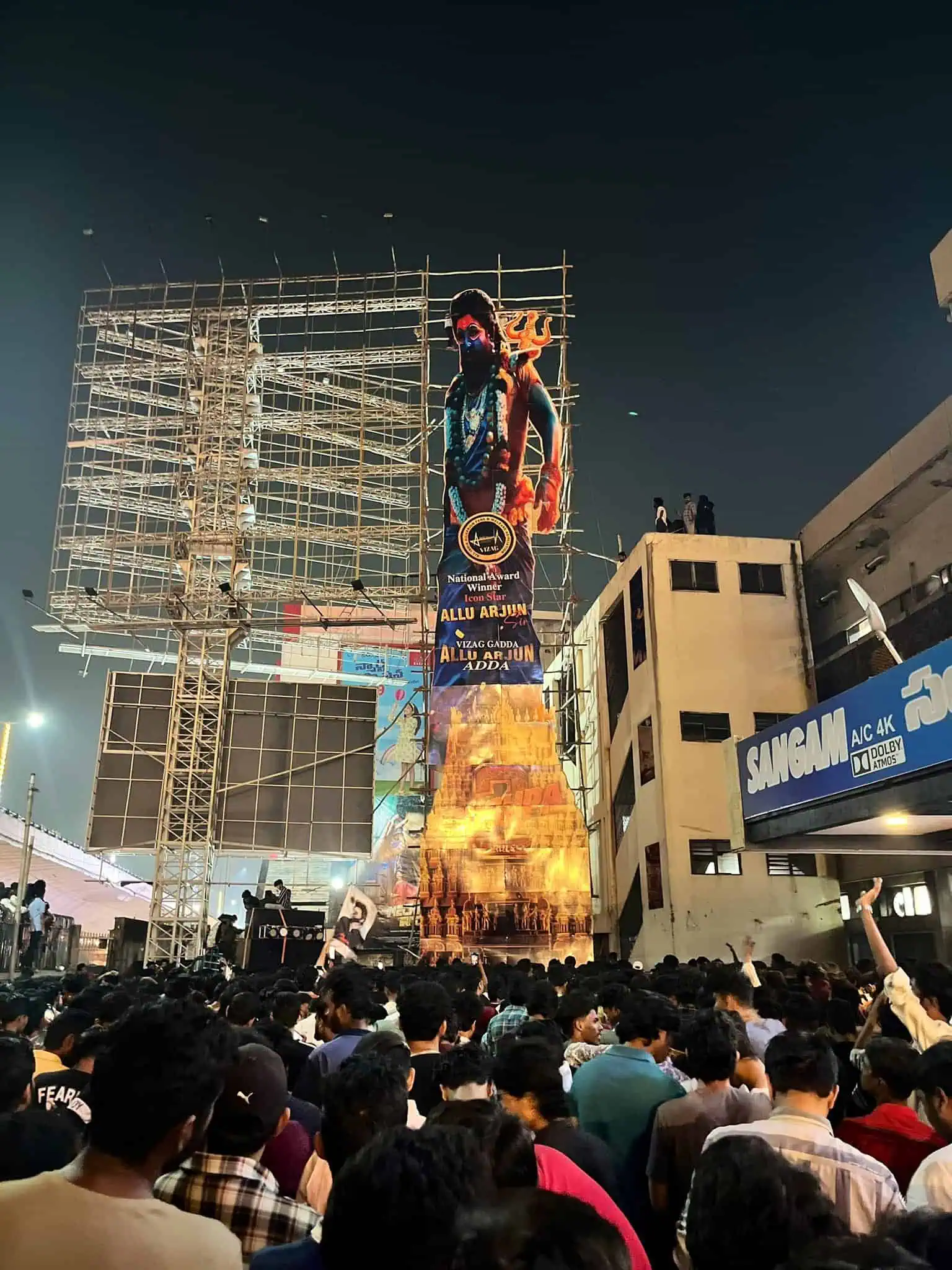 For the first time in the history of Telugu cinema, a huge cutout has been erected for Allu Arjun. The cutout, which is 108 feet high and 16 feet wide, was unveiled yesterday at the Sarath-Sangam Theatre complex in Visakhapatnam.
