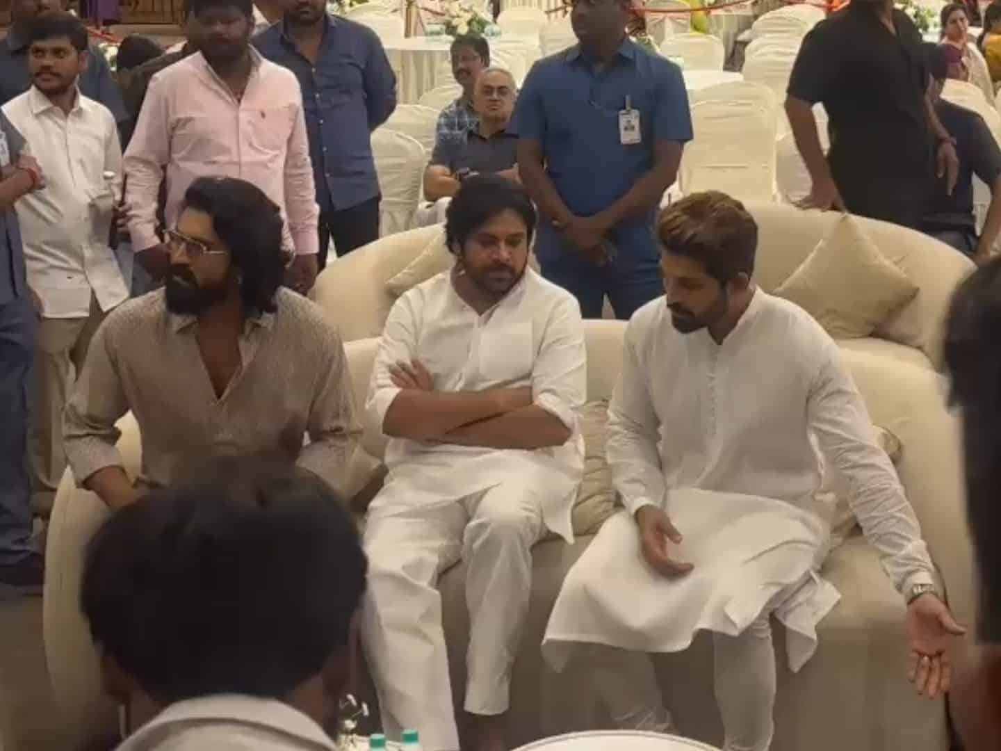 In one of the pictures, we can see Pawan Kalyan, Ram Charan and Allu Arjun in the same frame, which is a rare sight. We have seen Charan and Arjun separately, and Arjun and Pawan separately. But, Pawan accompanying them is a surprise.
