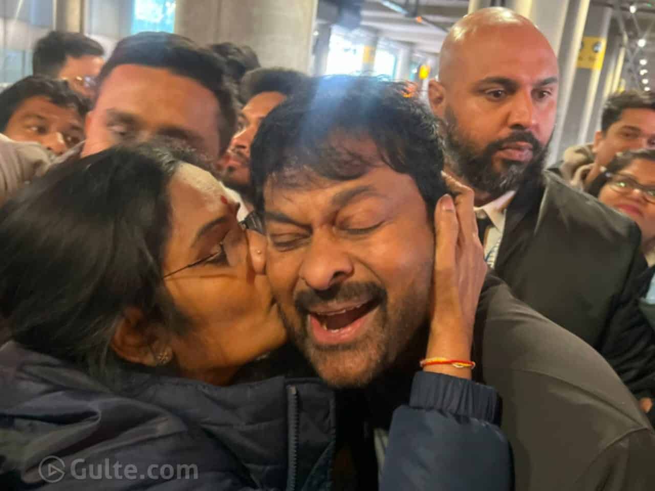 Interestingly, there is a woman who admires Chiranjeevi and she planted a kiss on Chiru’s cheek, showering motherly love to the actor. The picture is currently going viral on social media.