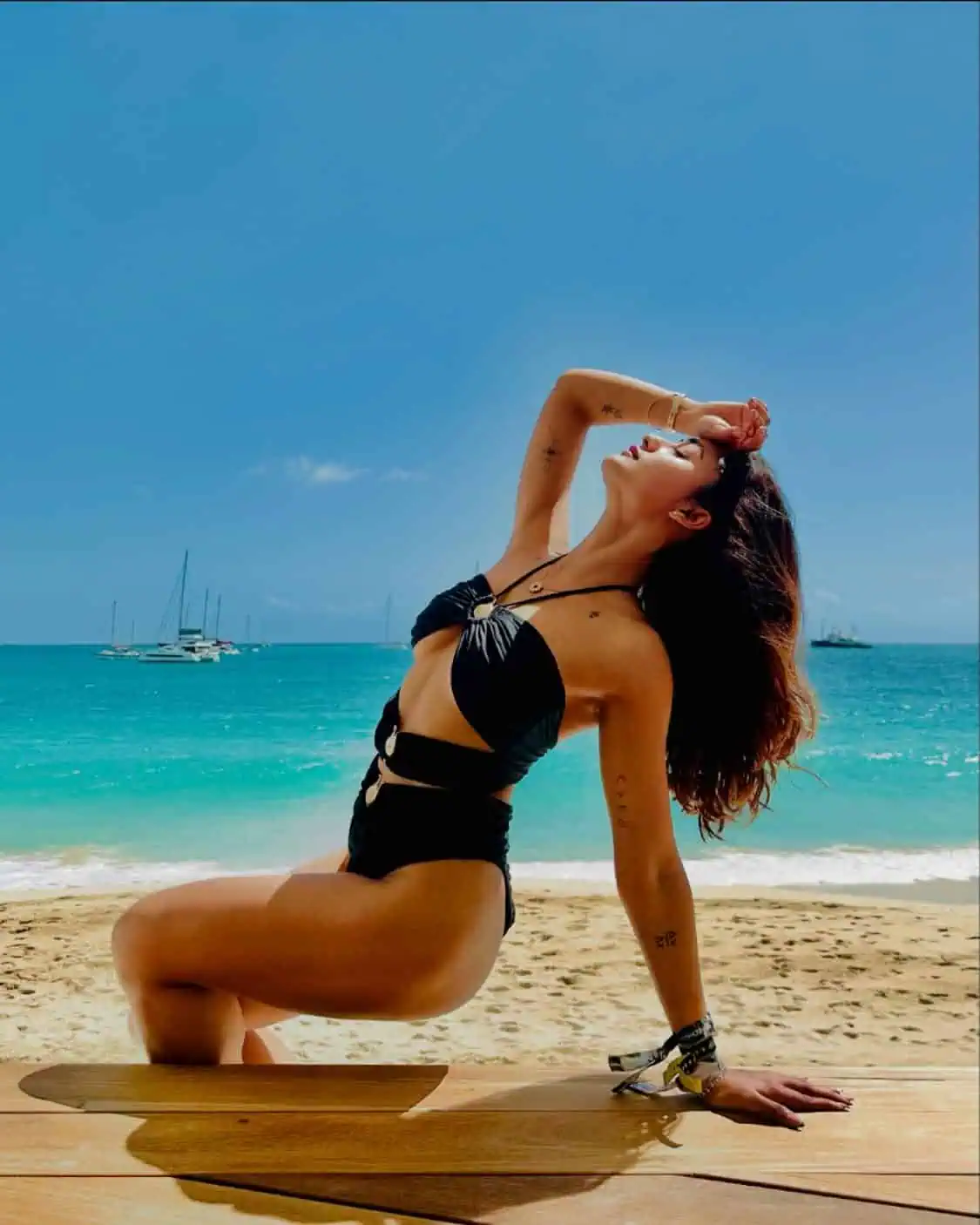 The Surya vs Surya actress, who has charmed Telugu audiences with films like Manasukku Nachindi and Anukunnadi Okati Ayinadi Okati, has embraced the summer heat in a daring black cutout monokini. Striking a gravity-defying pose with only a wooden stool for support, she effortlessly blends confidence with allure, proving that style is her second nature.