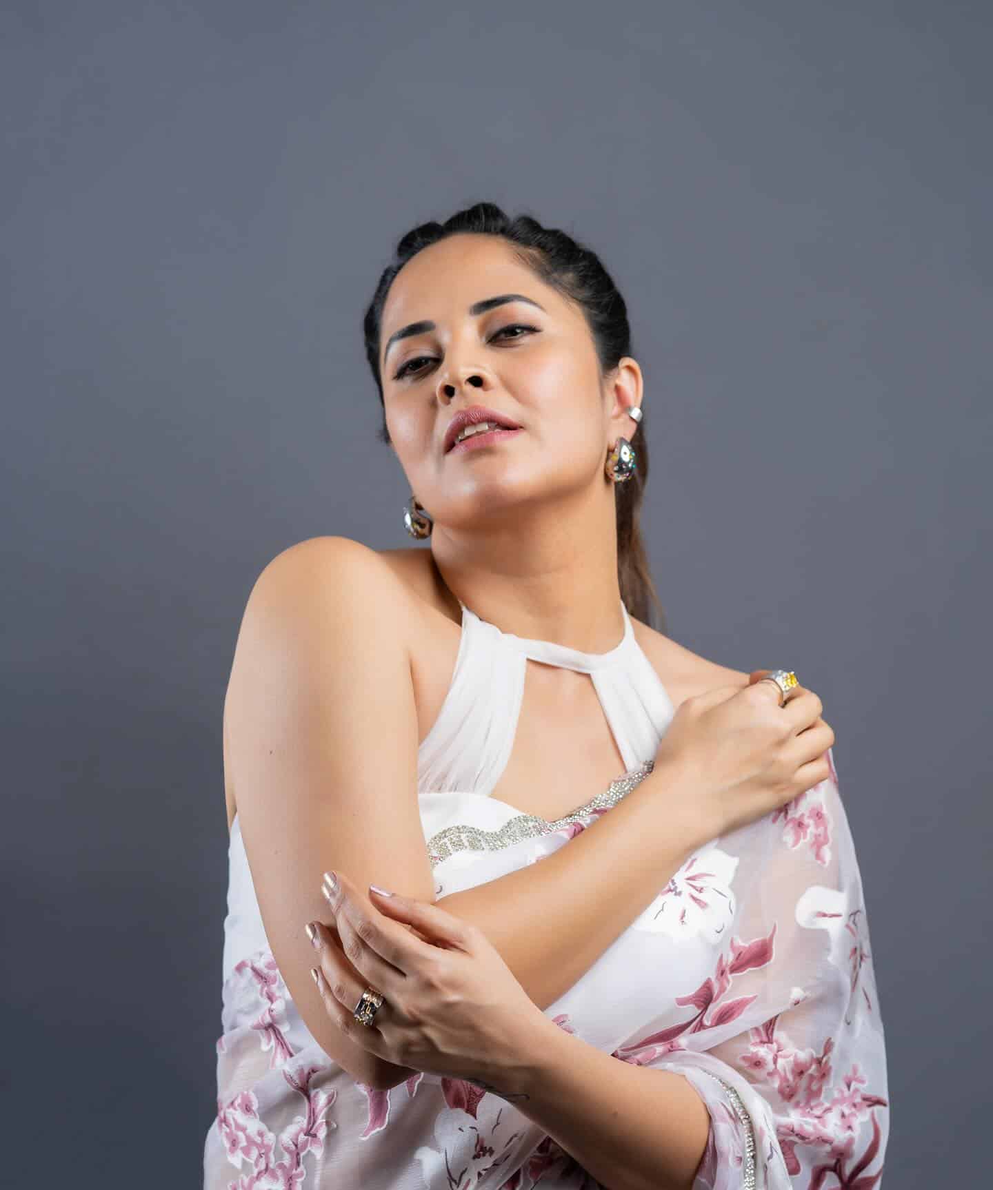 Anasuya recently posted a number of gorgeous photos of herself wearing a halter-neck top and a white and pink floral saree. She looked effortlessly elegant, accessorizing the ensemble with silver earrings and wearing her hair in a smooth high ponytail.