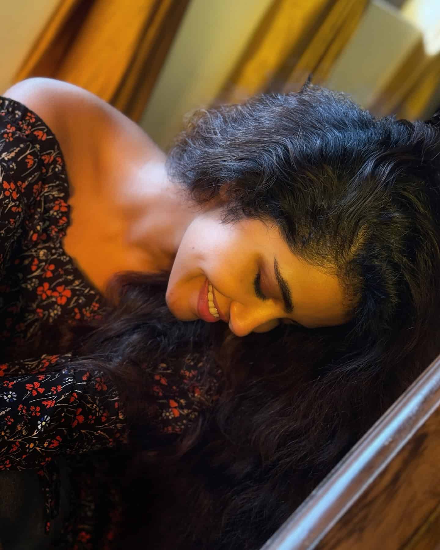 Dressed in a captivating black shoulder-drop dress adorned with beautiful orange floral accents, Anupama looks absolutely radiant. Her million-dollar smile and the picturesque sunset backdrop create a breathtaking visual.