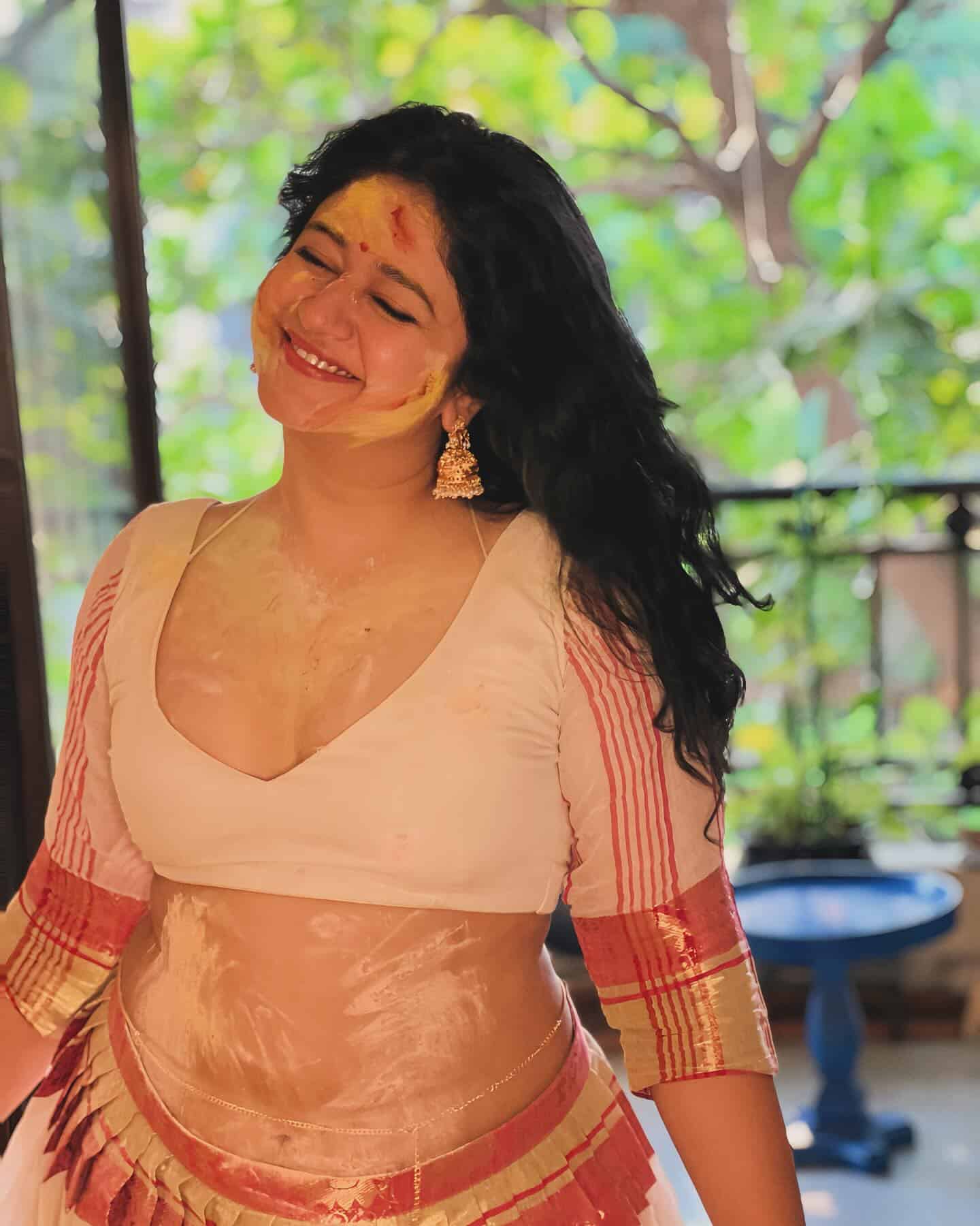 Dressed in a sizzling pattu lehenga blouse, she set the Holi stage on fire, effortlessly flaunting her chubby yet stunning beauty. With trendy goggles resting on her bindi-clad forehead, she blended tradition with modern sass, making heads turn.