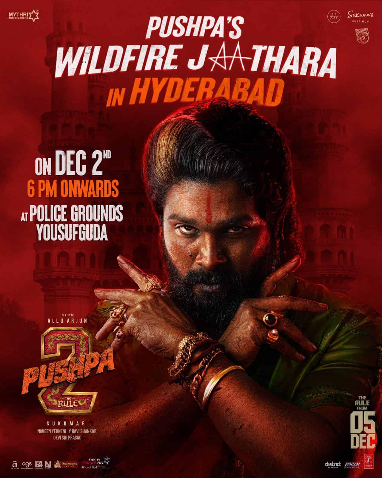 After successful promotional events in Patna, Chennai, Kochi, and Mumbai, and a special appearance by the film’s heroine Rashmika Mandanna at the closing ceremony of the 55th International Film Festival of India in Goa, the team is all set to bring the excitement to Hyderabad. Fans can expect a grand spectacle as they gather at Yousufguda Police Grounds to celebrate the upcoming release of the highly anticipated sequel.