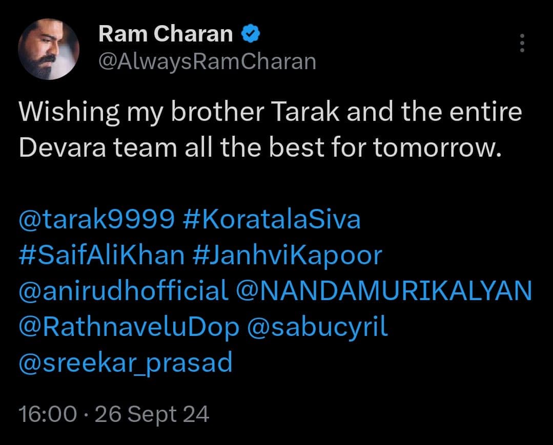 “Wishing my brother Tarak and the entire Devara team all the best for tomorrow,” wrote Ram Charan on X, conveying his wishes.