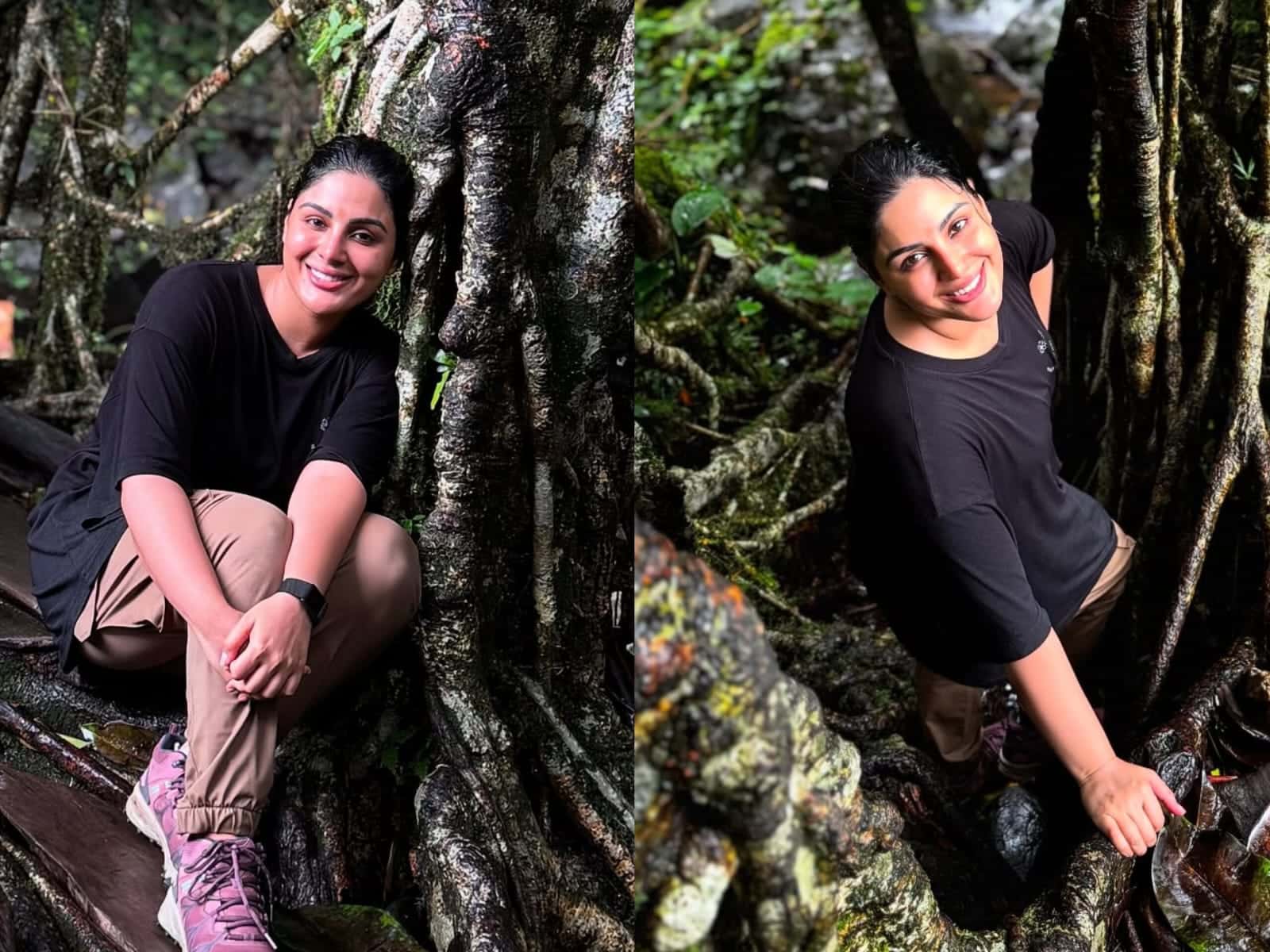 Her outfit matched the simplicity of the surroundings. A black t-shirt, khaki trekking pants, and pink trekking shoes made her ready for the roots, rocks, and muddy paths. In every shot, she looked like she belonged there, effortlessly blending practicality with style, showing that adventure and elegance can coexist.