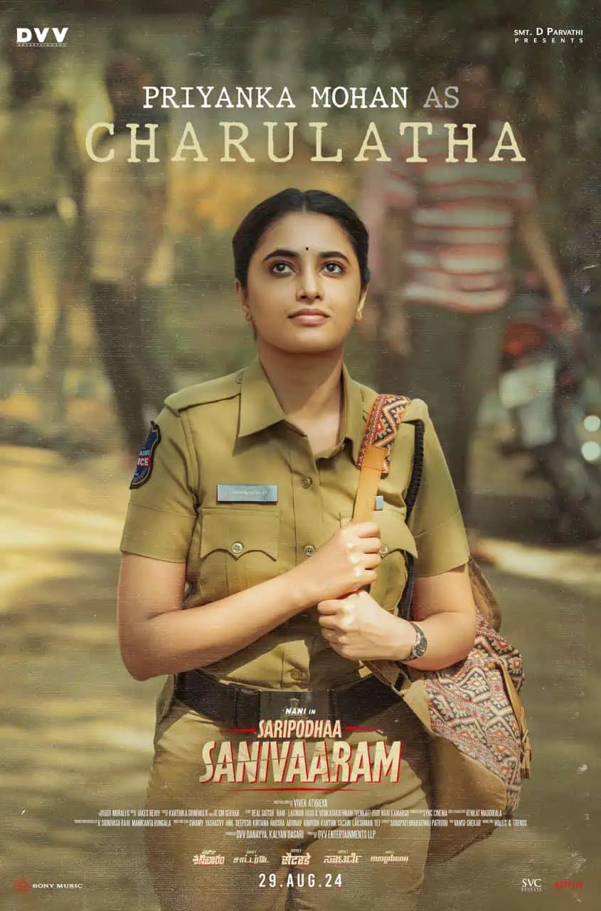Nani and Priyanka Mohan are working together for the second time in the upcoming film Saripodhaa Sanivaaram. The actress appeared in a girl-next-door kind of role in Gang Leader. Today, the makers revealed Priyanka’s first look from Saripodhaa Sanivaaram.