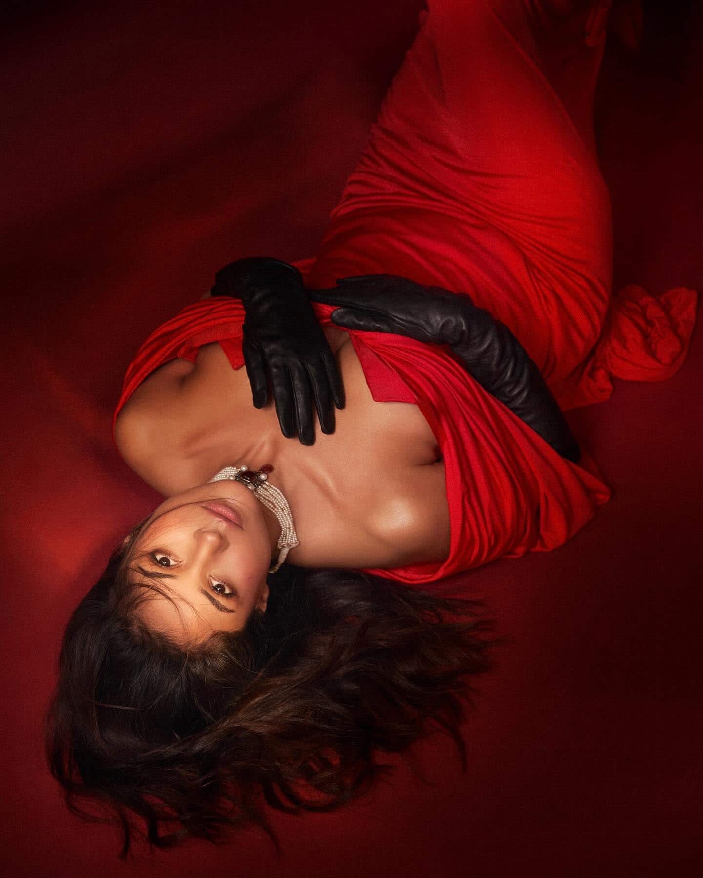 And she’s back to prove it once again! In a recent photoshoot, Shehnaaz is absolutely sizzling hot in a stunning red gown with a shoulder drop design. The long gown flows gracefully around her as she poses confidently on the red carpet. To complete the look, she accessorizes with black gloves, open hair, and a touch of glossy makeup. The pearl necklace adds a touch of elegance and sophistication.