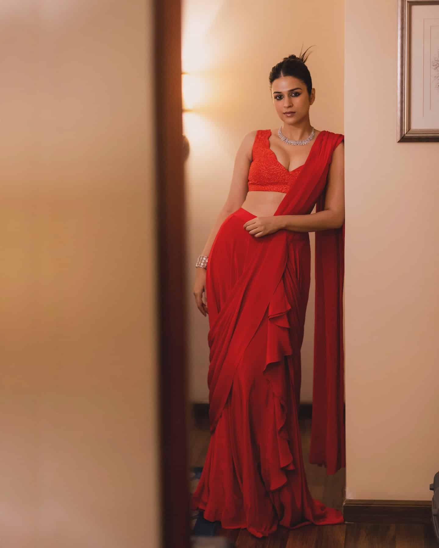 Shraddha Das is setting the internet on fire in a fiery red saree! The actress is a vision in red, rocking a stunning saree with dramatic flares.