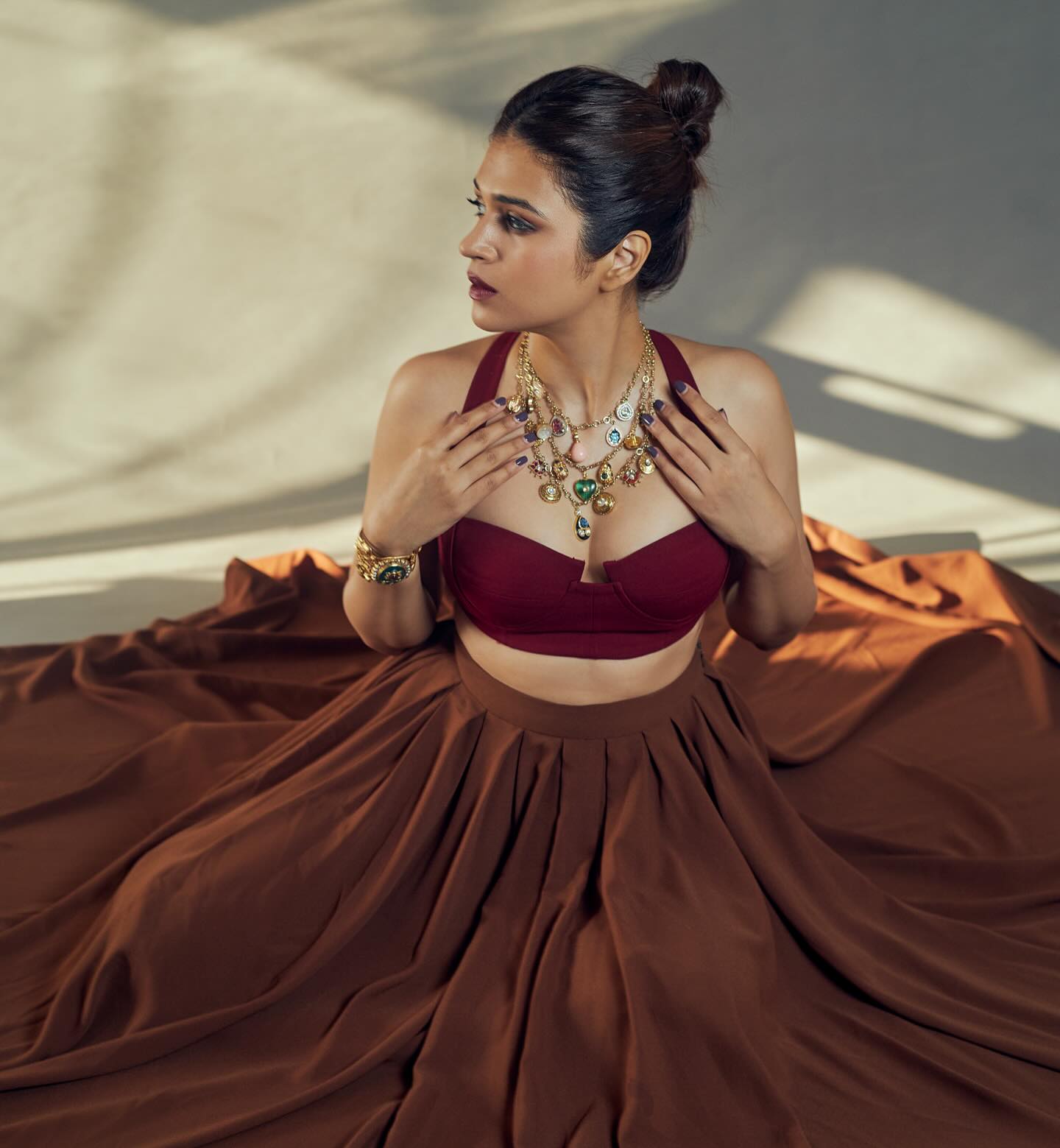 Donning a brown lehenga paired with a maroon sleeveless top, Shraddha exudes elegance and grace. The look is further accentuated with multiple gold chains and a matching bracelet. A high bun keeps her hair styled neatly, while maroon lipstick and matching gold eyeliner add a touch of drama to her subtle makeup.
