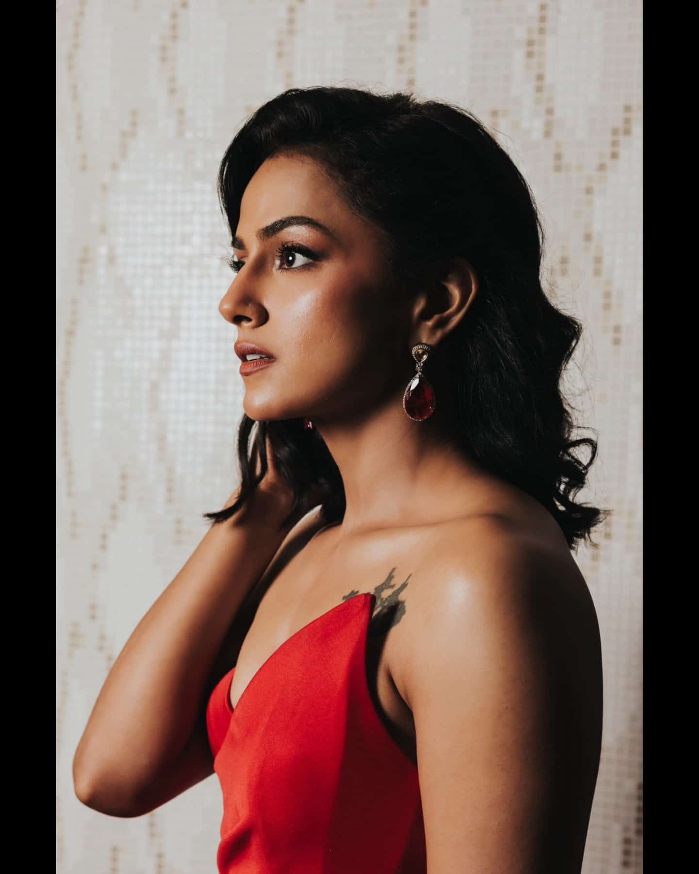 Dressed in a bold red off-shoulder gown with intricate ruched detailing, Shraddha exudes confidence and glamour. Her golden earrings and flowing hair add to her overall appeal, making her one of the most stylish attendees at the event.