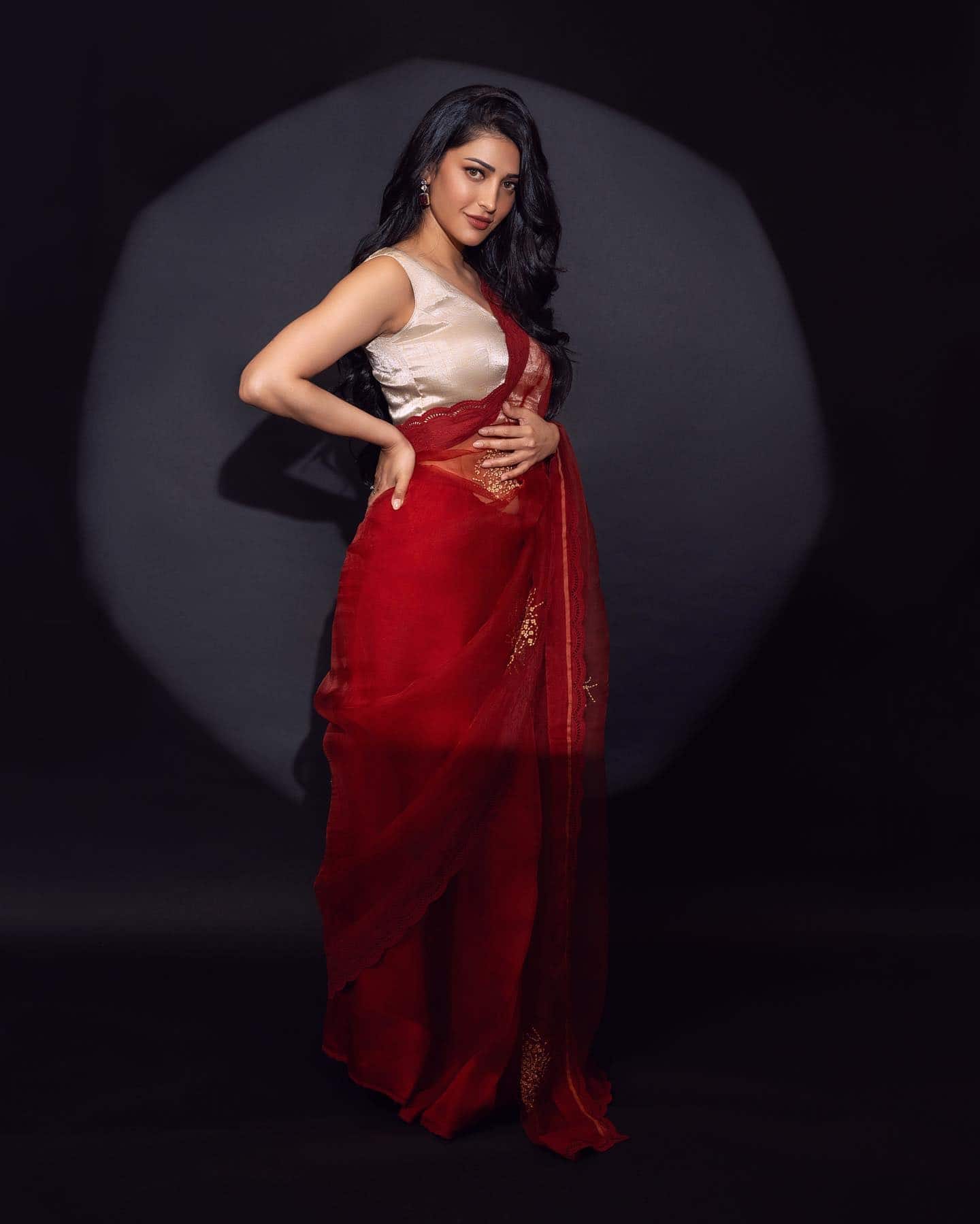 Shruti Oozes Elegance in Fiery Red Saree!