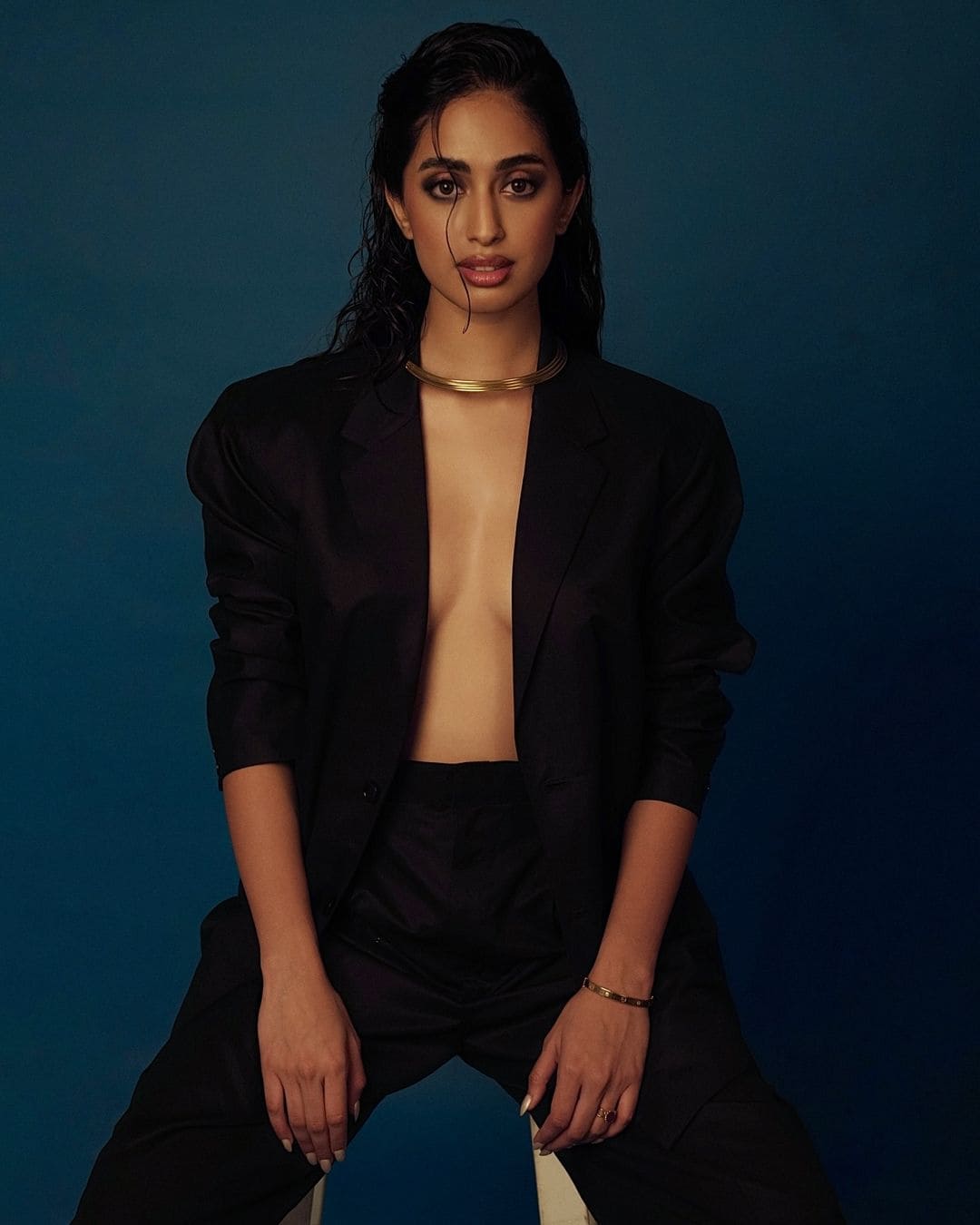 Donning a black blazer and matching formal pants, Shetty exuded confidence with the open button detail offering a hint of skin. The braless look added a touch of sensuality, further accentuated by a delicate gold necklace. Keeping her hair down in loose waves and rocking a glossy eyeliner with pink lipstick, Sini served up serious glam. This isn’t your typical pageant girl look, and Shetty is totally owning it!