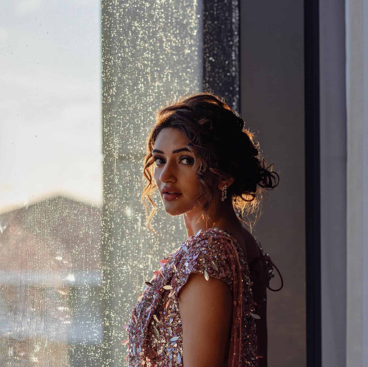 She wore a sequined saree with detailed beadwork that added just the right amount of shine. The shoot happened indoors, but the wide windows behind her showed a city view, probably from a high-rise. The warm light coming through added a calm and rich feel to the pictures.