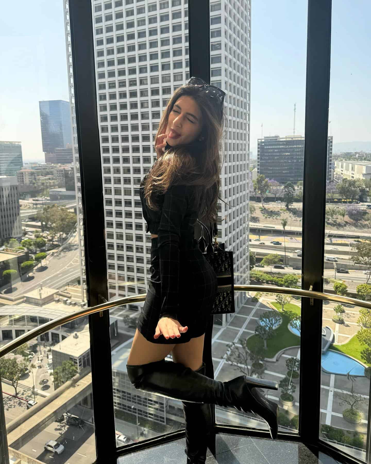 She rocked a sultry black crop top that flaunted her toned midriff, paired with a matching mini skirt that accentuated her curves. The outfit was perfectly complemented by a pair of high black boots, adding an edgy vibe to her look, while her stylish sunglasses gave her that effortlessly chic touch.