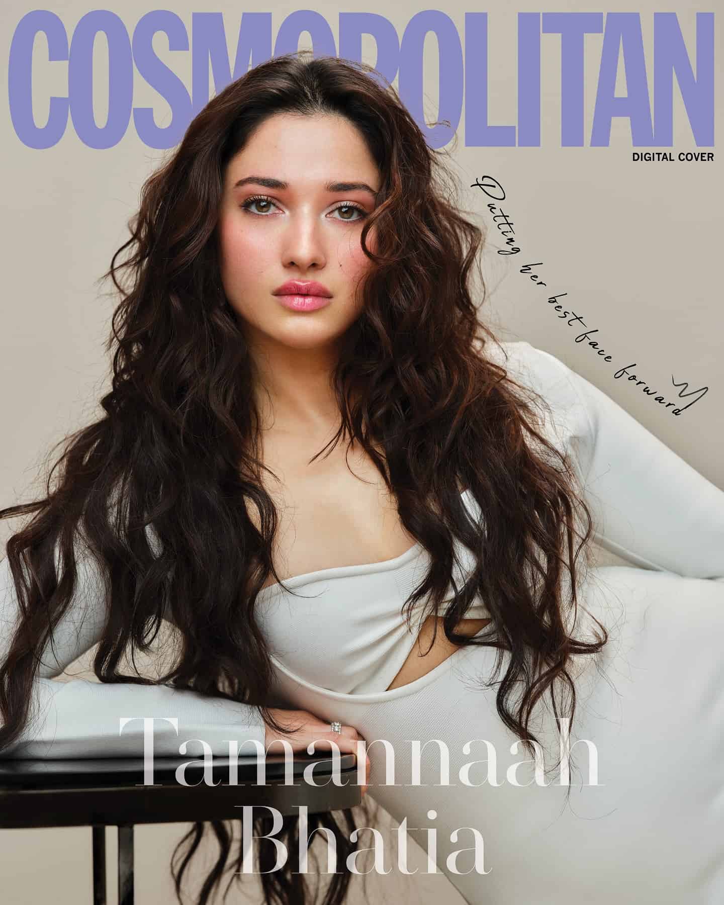 Tamanna Bhatia, the actress known for her ethereal beauty and captivating performances, graces the cover of Cosmopolitan magazine in a stunning display of contrasting colors.