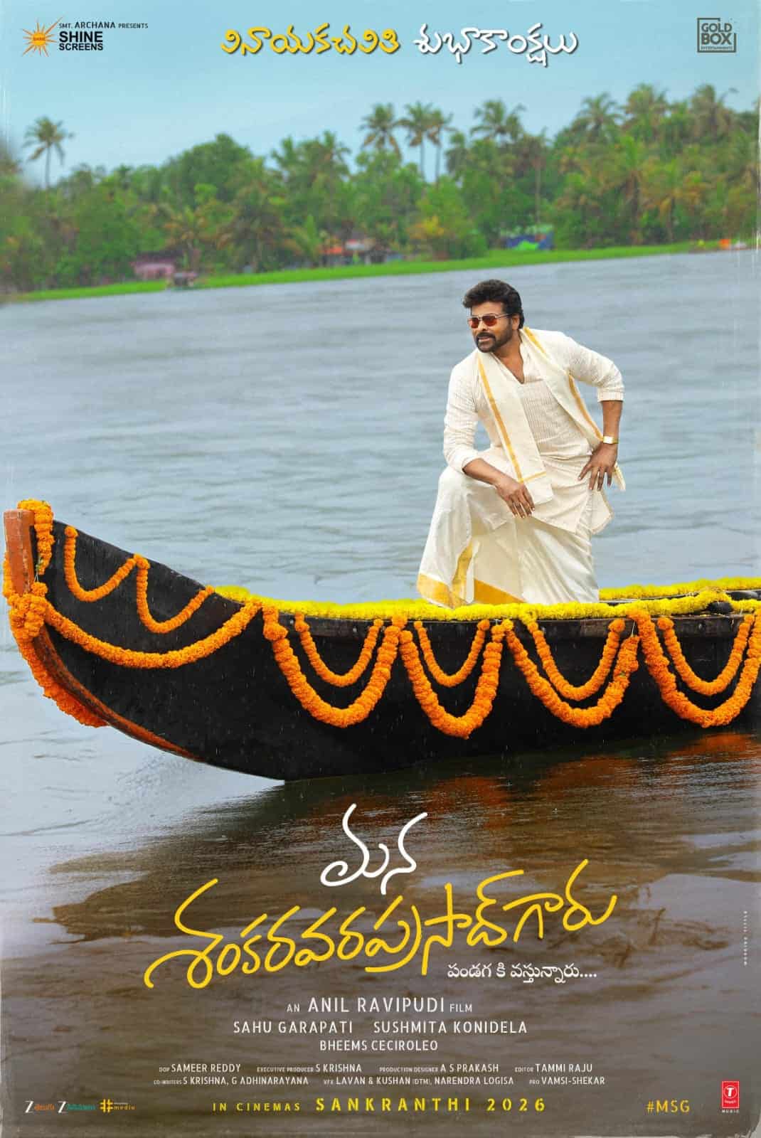 Today, on the propitious occasion of Vinayaka Chavithi, the makers unveiled a new poster, and this is a contrasting look from what we saw in the glimpse. Sporting a silk shirt, panche, kanduva around his neck, and cool shades, Chiranjeevi is seen striking a stunning pose on a boat. It’s a mix of grace and attitude that only the Megastar can pull off.