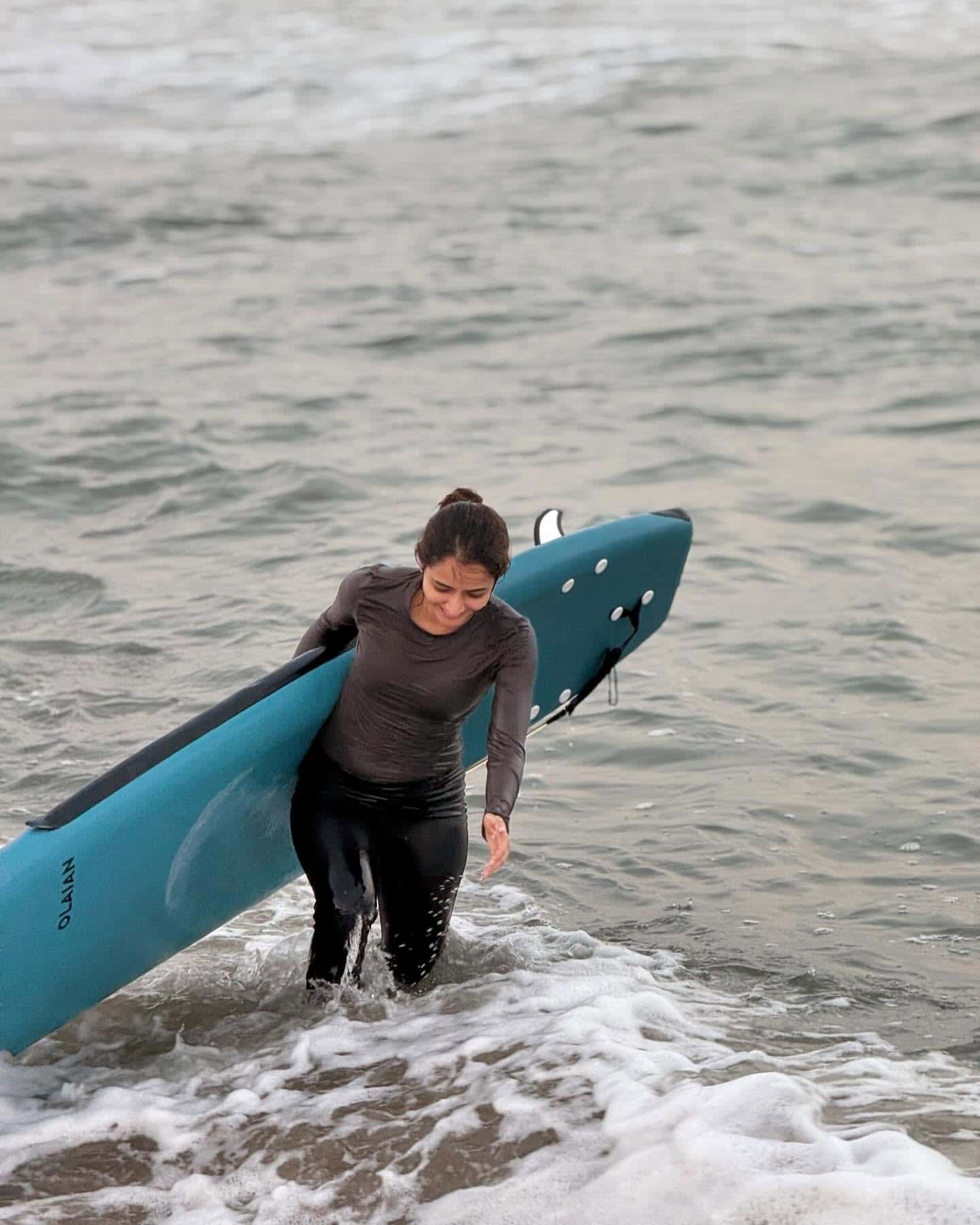 The actress was recently spotted surfing at Kovalam Beach, clad in a grey top and black pants, radiating positivity and exhilaration. Captioning her post, Ashika expressed her excitement about the experience, saying, “When you’ve got a day off from work and wanna do something funnn… Our first time surfing, and it was so much fun and exhilarating!” along with her sister Anusha Ranganath, as the perfect partner for trying new adventures. Her candid photos and tales showcased a fearless side that many found deeply inspiring.