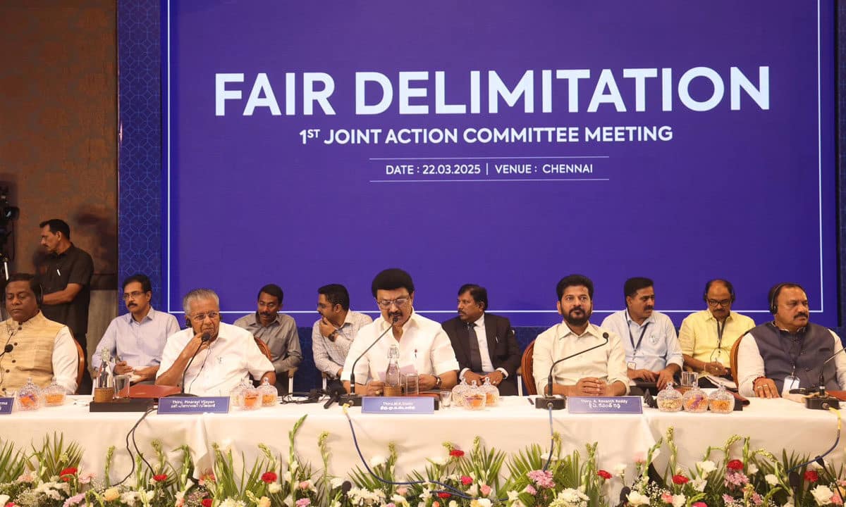 At an anti-delimitation conference in Chennai, key political parties from South India came together to oppose any changes in constituency boundaries for the next decade. Tamil Nadu Chief Minister Stalin chaired the meeting. The Chief Ministers of Telangana, Kerala, the deputy CM of Karnataka, many opposition leaders, and others took part in the meeting.